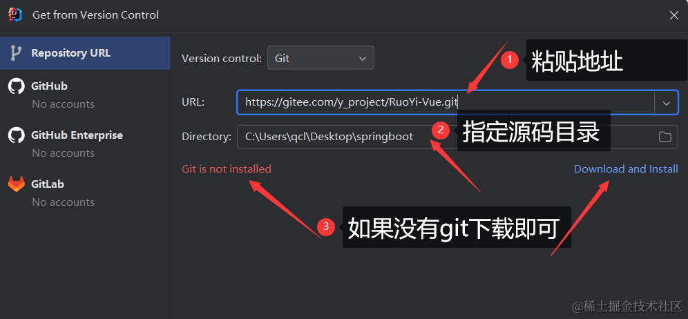 然后把复制的下载地址粘贴到如下图所示的地方,记得指定源码路径,安装下git。