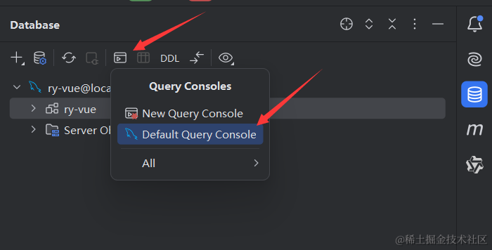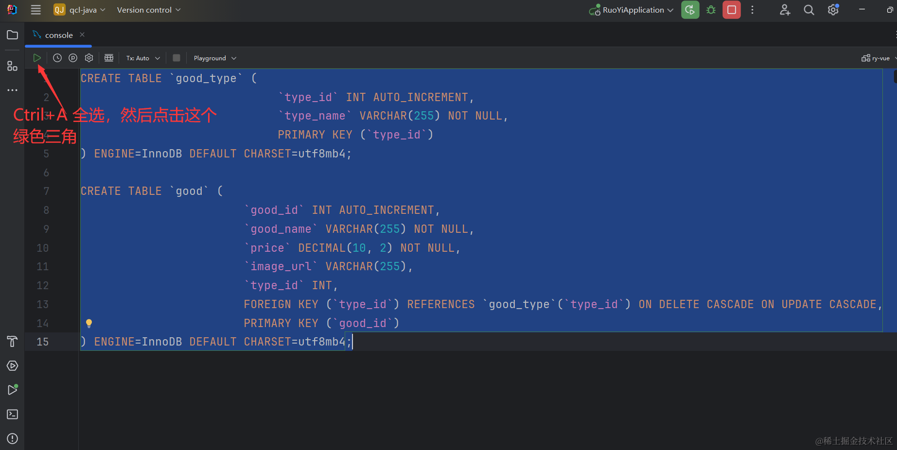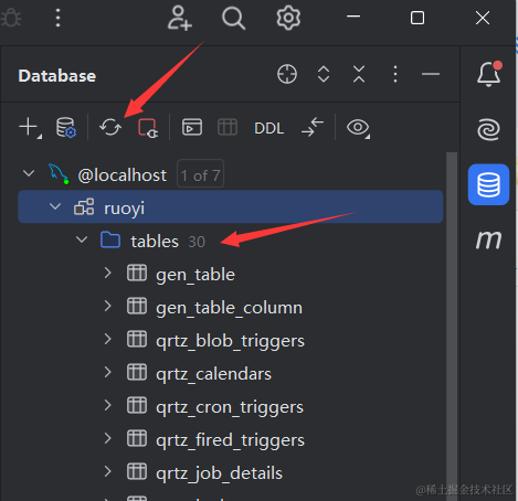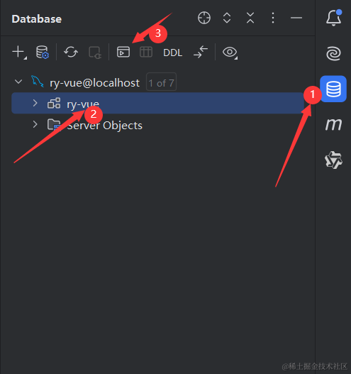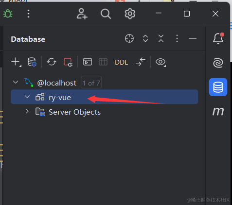 所以我们先用idea自带的mysql管理工具,链接我们的mysql数据库,然后创建一个ruoyi的数据库。至于mysql的安装和使用idea链接mysql我这里不拆开讲了,可以去看下我Java基础入门的视频和博客笔记。我会在视频里给大家演示的。
