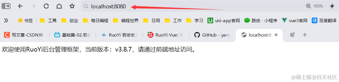 启动成功后通过http://localhost:8080 看到如下所示,就代表若依版的springboot项目已经成功运行了。