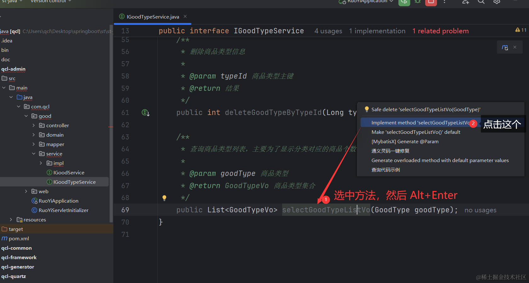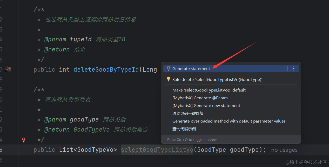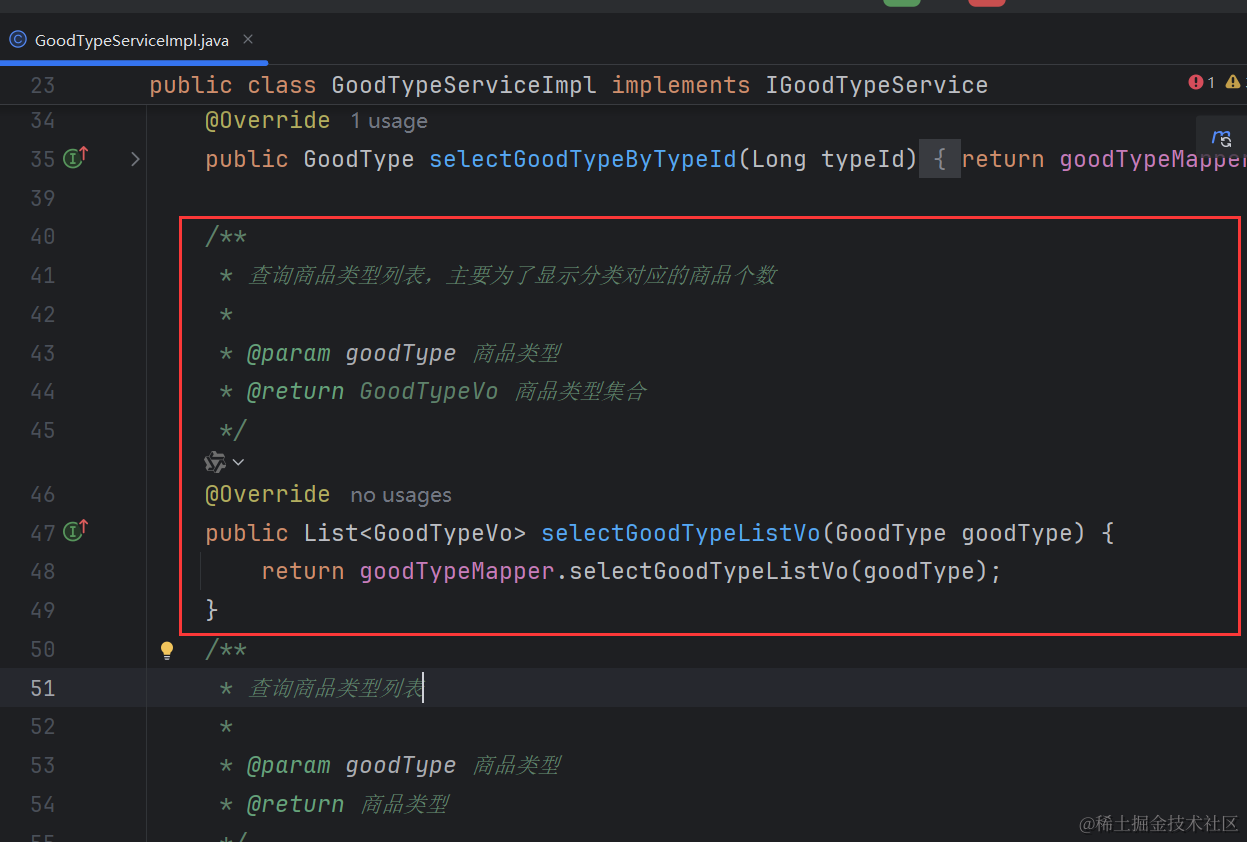 然后我们的GoodTypeServiceImpl类里自动生成了如下代码