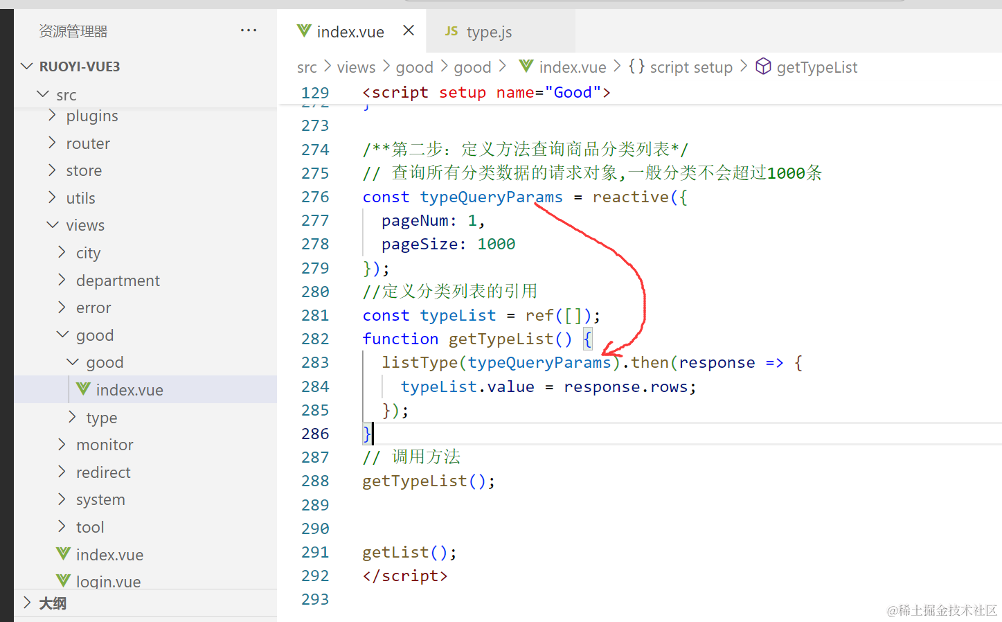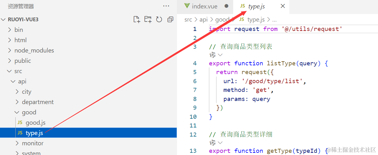 我们要请求分类数据,就要先去api目录下的type.js里找到查询分类列表的方法。如下图所示。