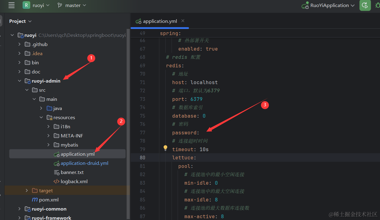其实配置reids很简单,只要你电脑上已经成功安装并启动redis,一切都保持默认即可。由于我的电脑本地redis没有设置密码,所以不用配置reids即可,当然如果你设置了redis访问密码,记得去下图所示的地方将修改密码。如果和石头哥一样没有设置reids密码,password后面空着即可。