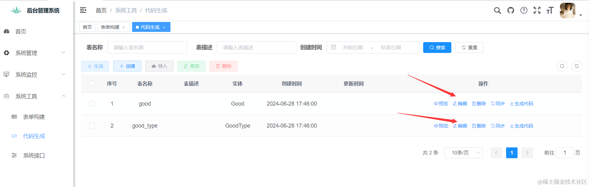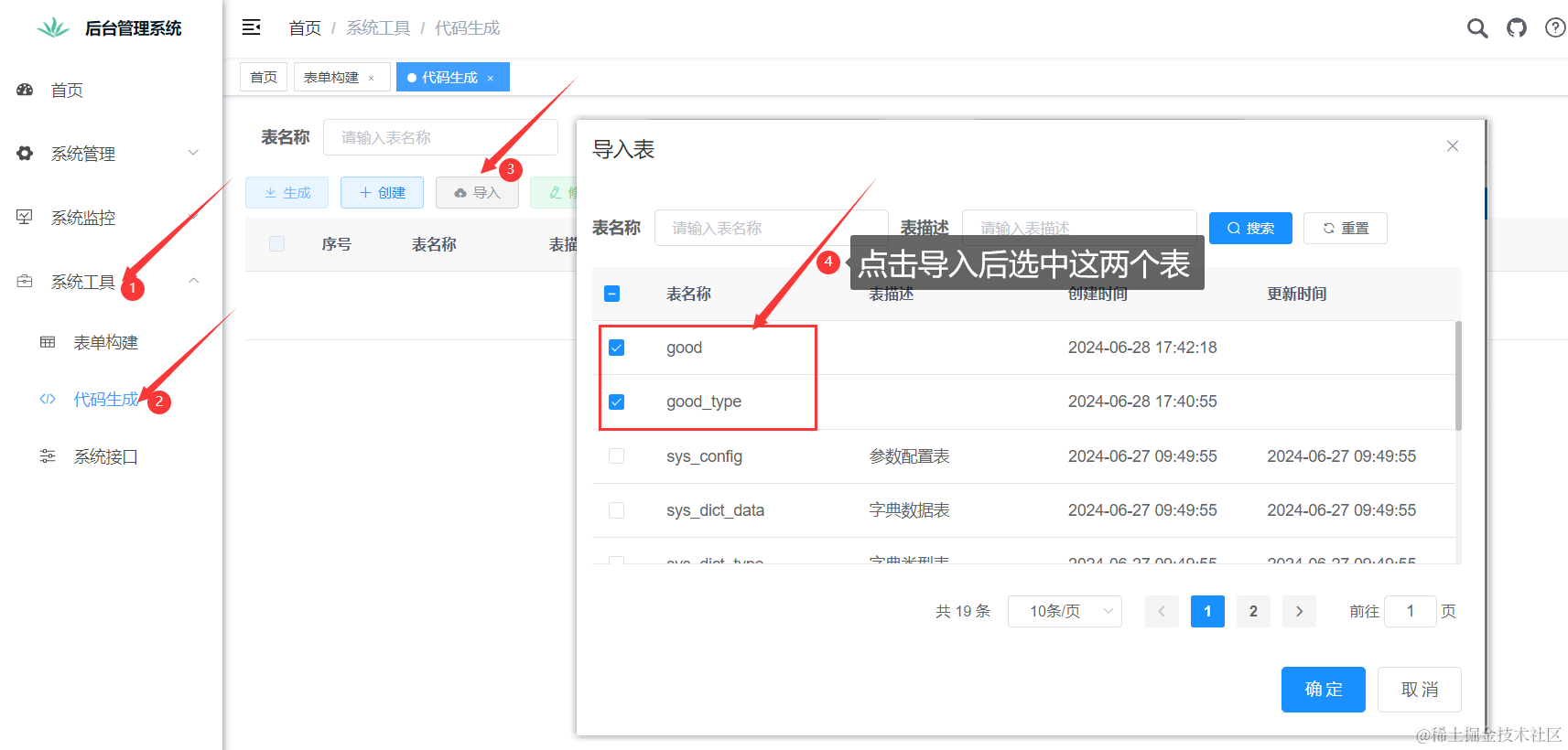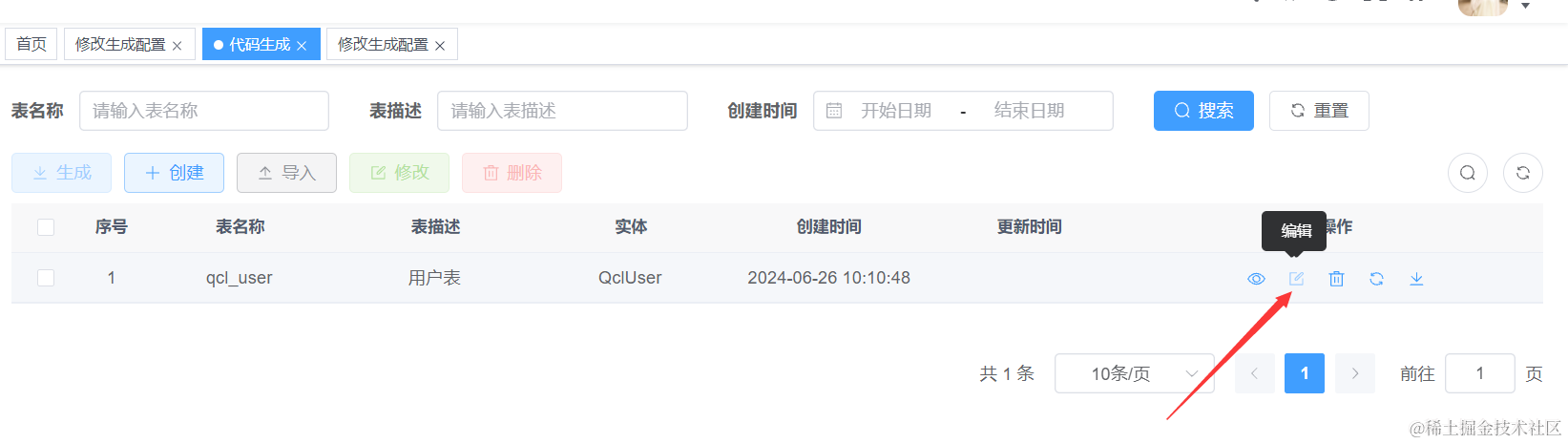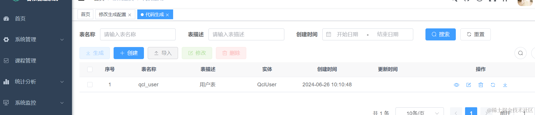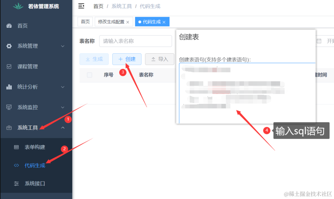 ) comment '用户表';我们借助若依提供的功能来实现数据表的创建,这里qcl_user是我们的表名,大家最好和石头哥保持一致。点击系统工具,然后点击代码生成,点击新建,把上面的sql语句复制到这里即可。
