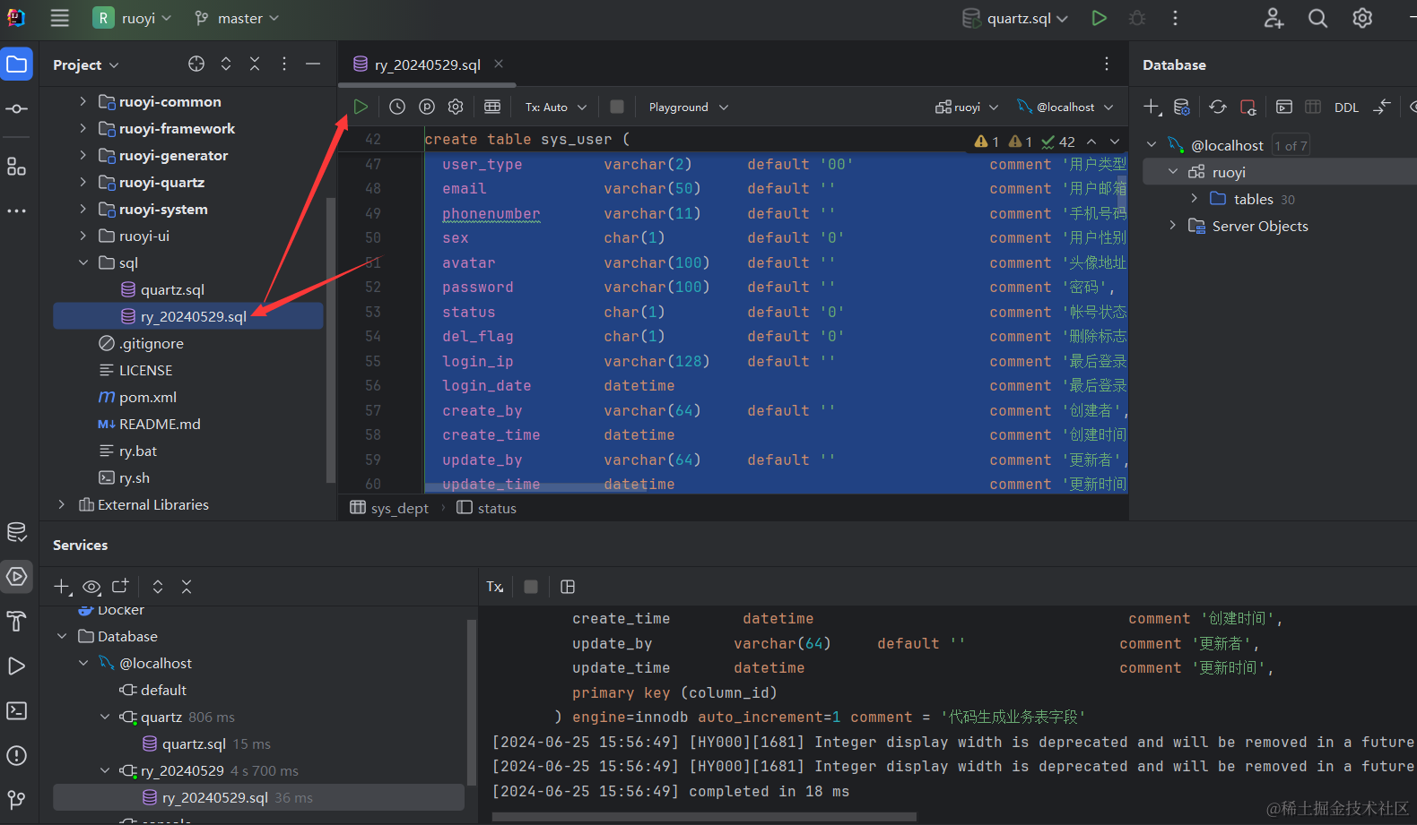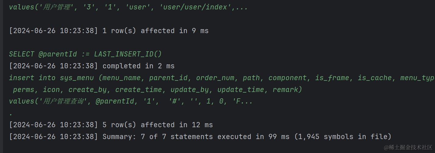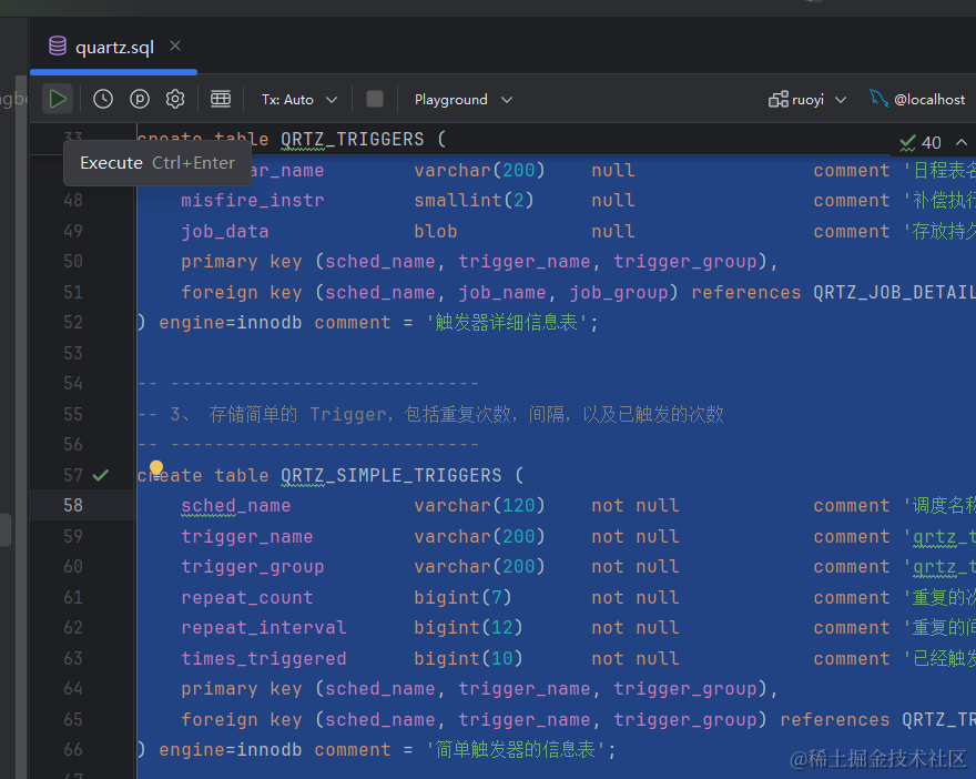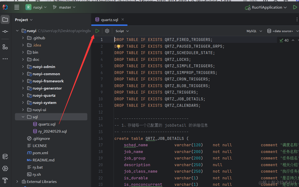 创建好ry-vue数据库,这里数据库名最好也是用ry-vue,因为后续运行项目时官方代码里就是取得这个数据库名。创建好数据库以后,就可以执行sql下的文件了。我们先执行quartz.sql文件
