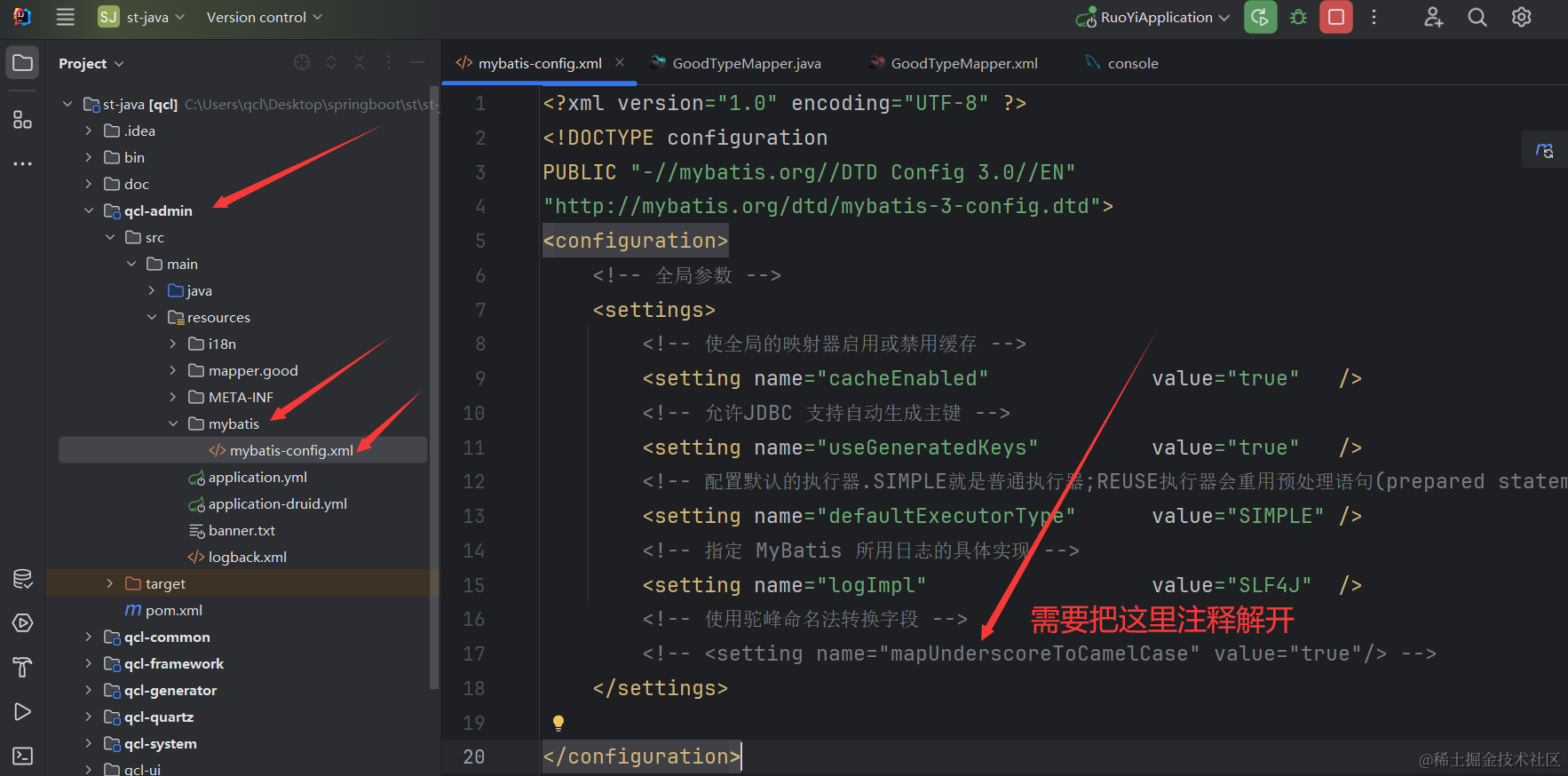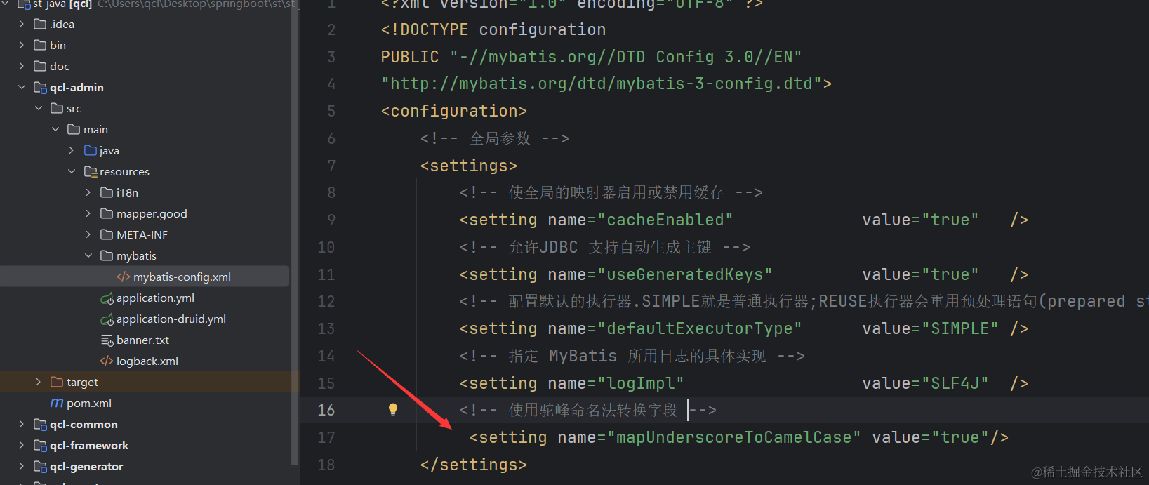 我们写好联表查询的sql以后,还有一个问题,就是我们返回的vo类里使用的是goodCount 驼峰式命名,但是sql里的good_count 下划线命名,为了保持一致,我们需要把mybatis配置文件做下修改。