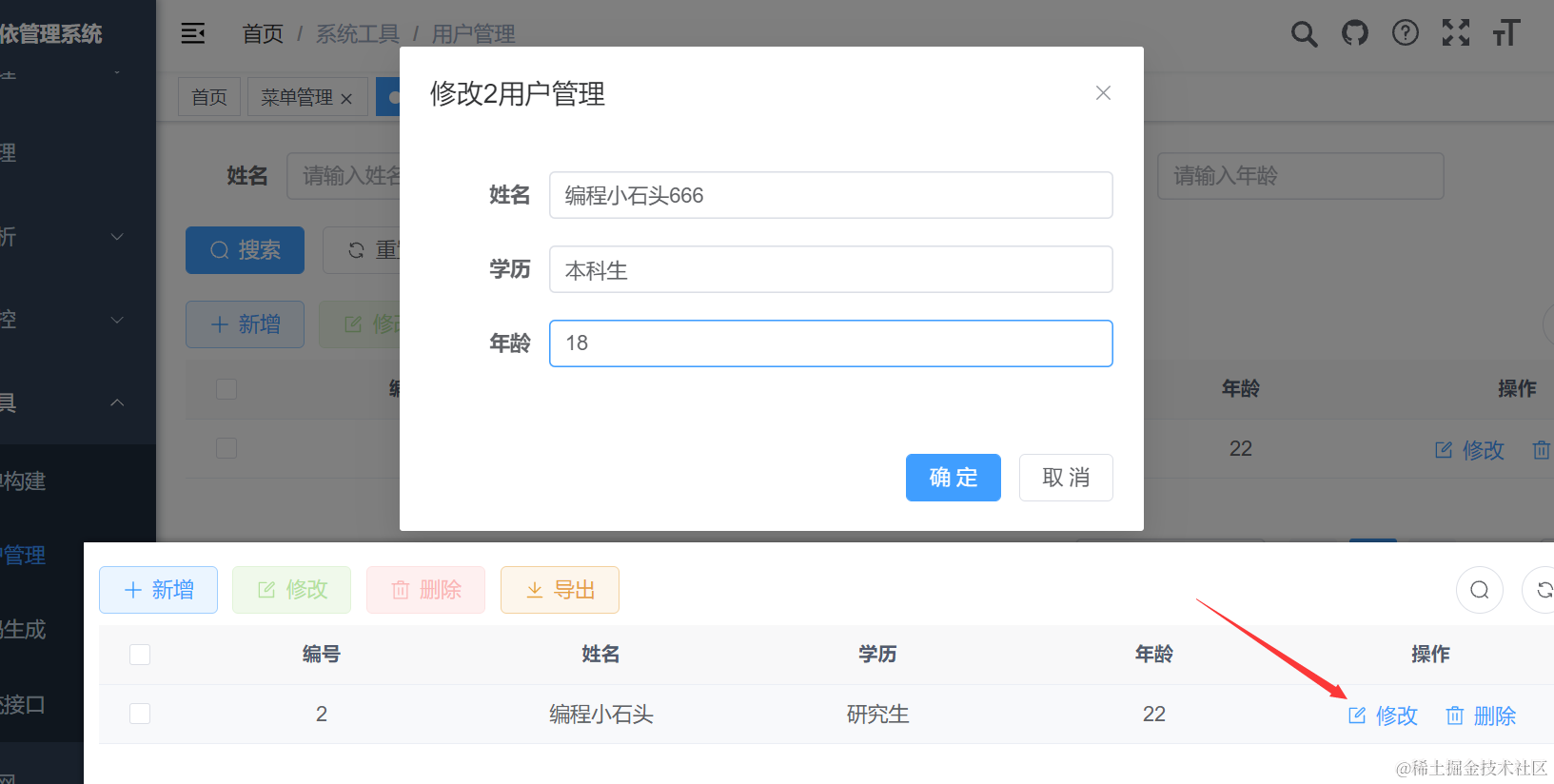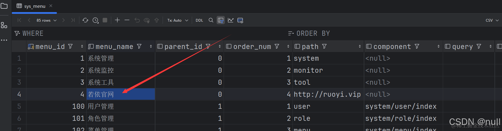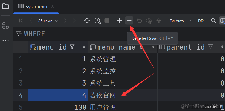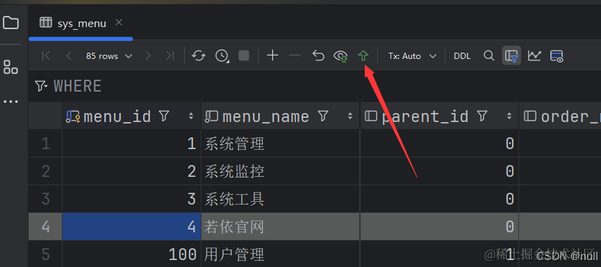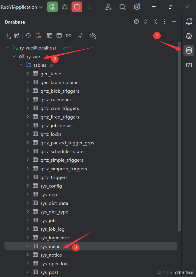 因为侧边栏我们是从数据库里动态加载的,所以要去数据库里删除对应的数据。我们去idea里借助mysql管理工具,找到sys_menu数据表,然乎双击打开。