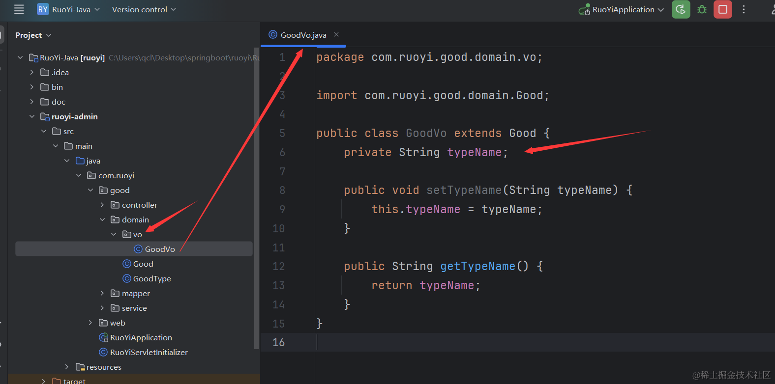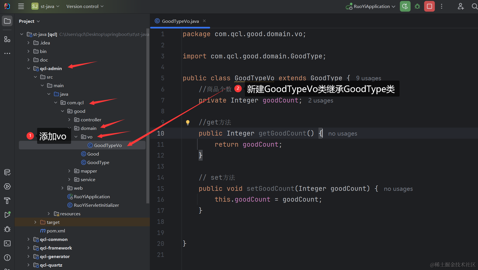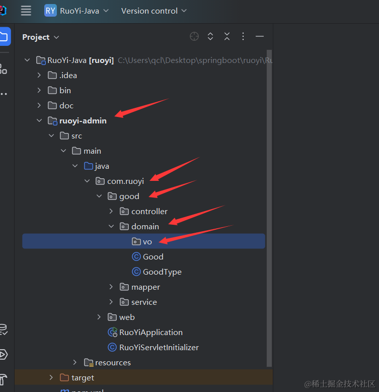 我这里的qcl-admin,就是你项目里的ruoyi-admin,然后再domain里先创建一个vo文件夹,然后创建GoodTypeVo类