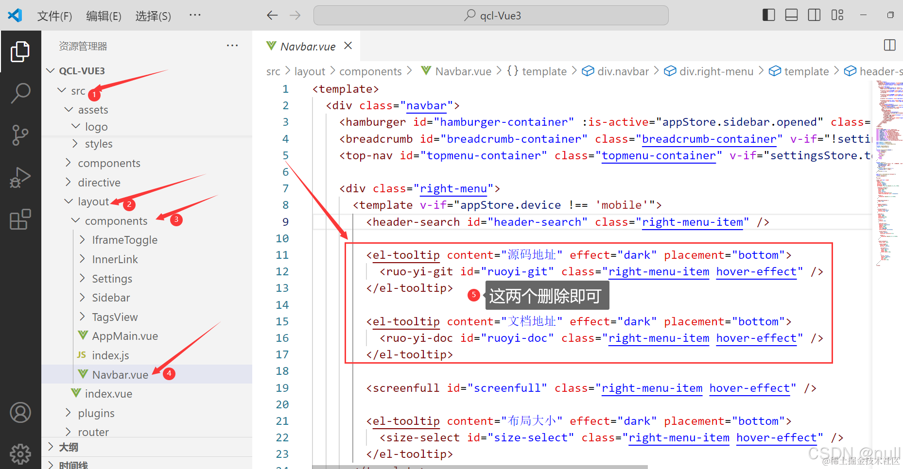 我们到vscode里找到对应的源码删除即可。然后就可以看到左上角没有了之前的两个图标