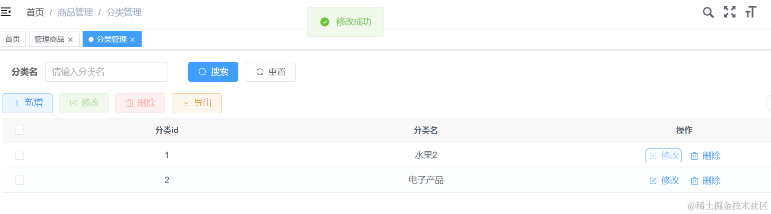 我们查询到了商品分类id对应的分类名称了,前面Java代码实现完,我们vue前端代码只需要把之前显示的分类id改为分类名称就行了。