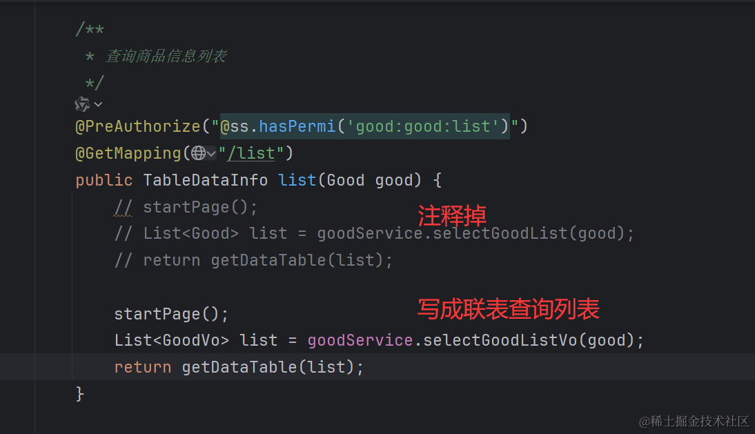 因为我们之前查询商品列表没有做联表查询,所以需要把商品的查询语句改造下,就是把下面的代码改造下。