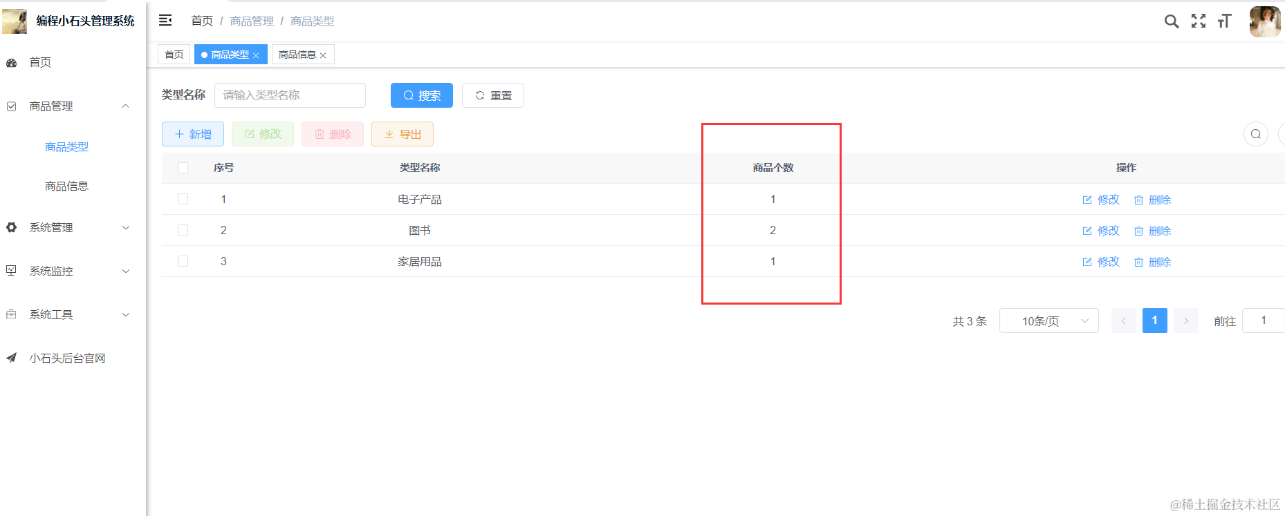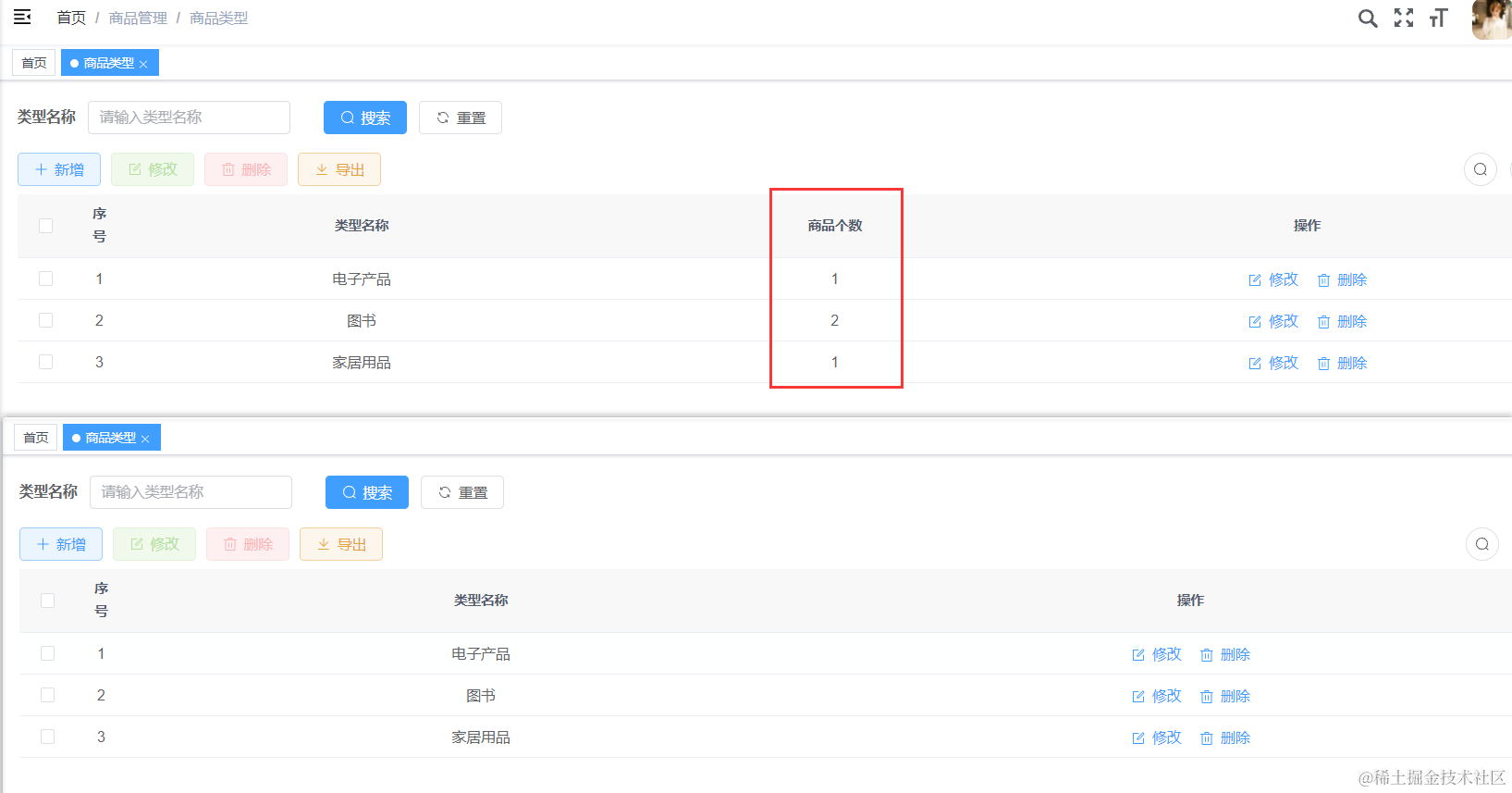 我们查询到了分类下的商品个数,前面Java代码实现完,我们vue前端代码也要加一列,来显示商品个数。
