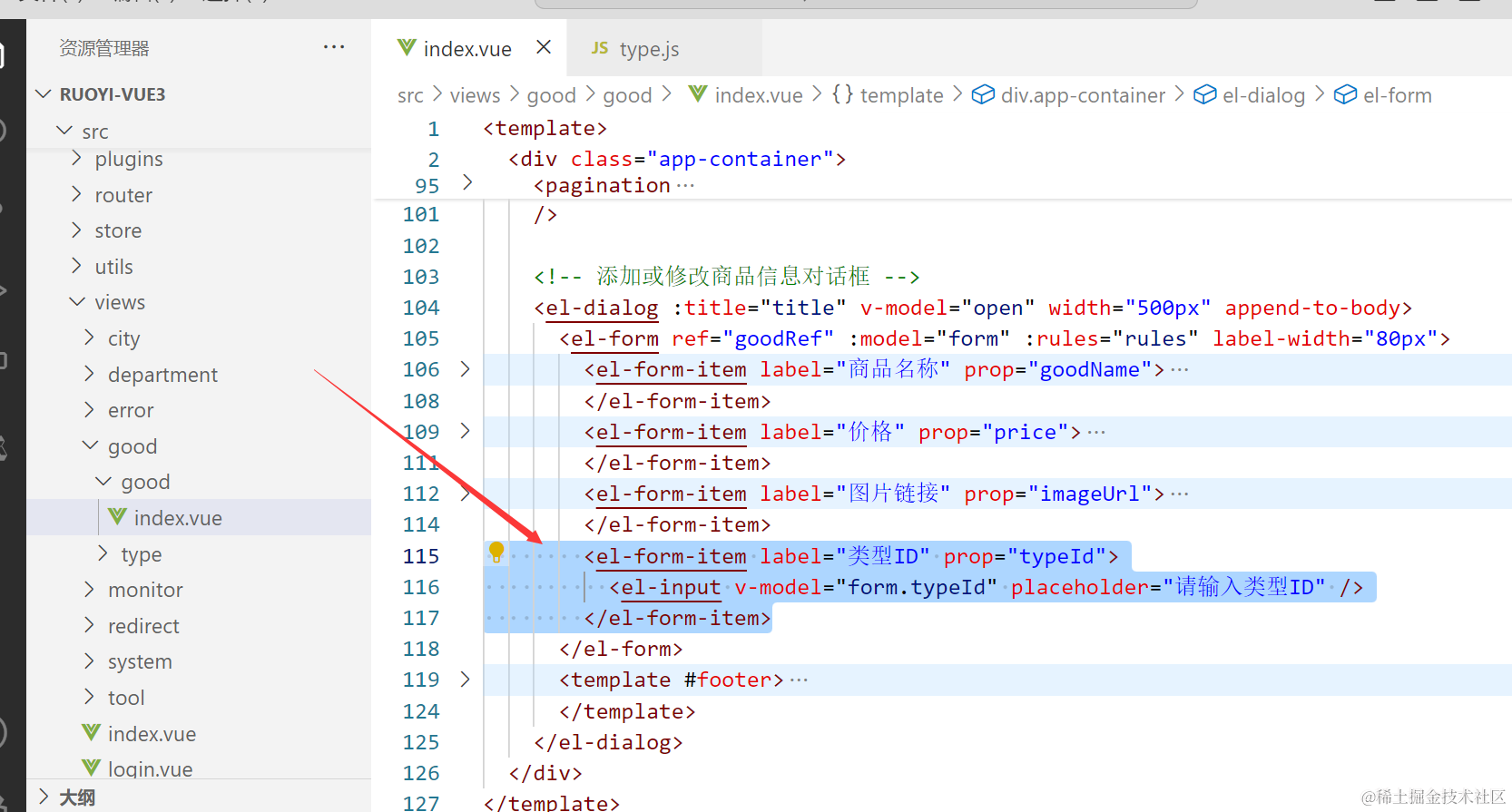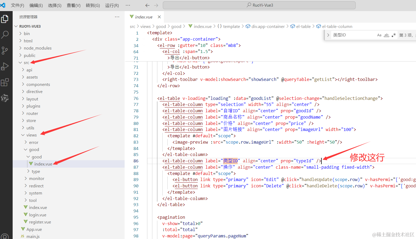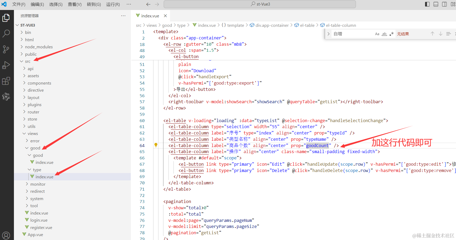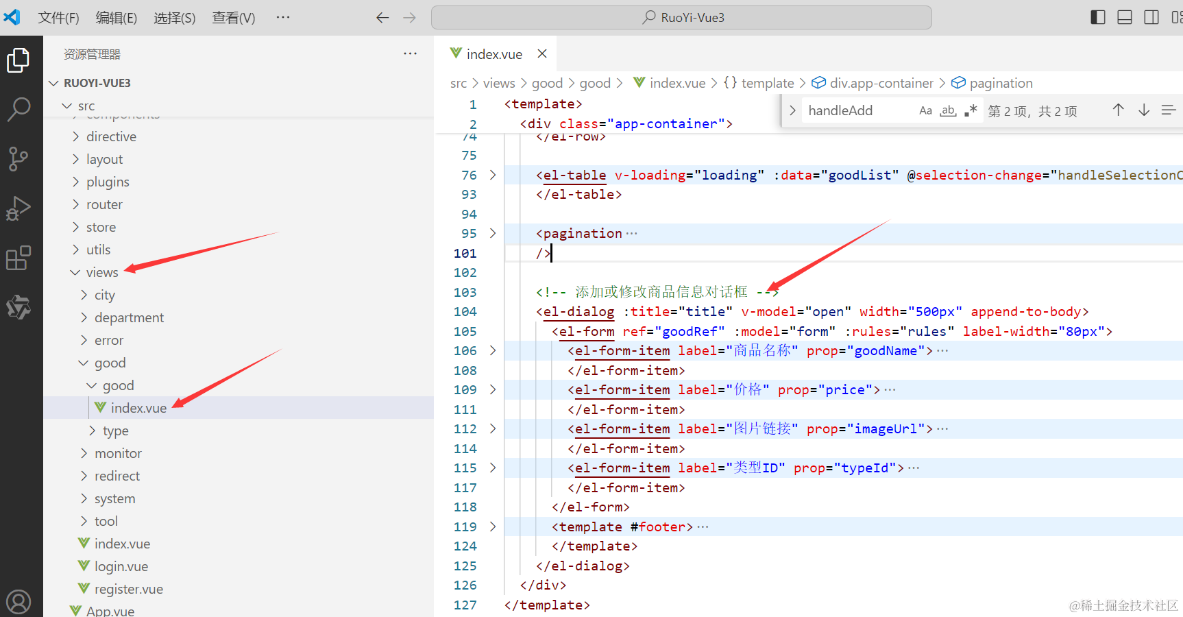 我们的添加商品弹窗是属于前端vue项目的代码,所以我们先找到添加商品弹窗对应的代码。如下图