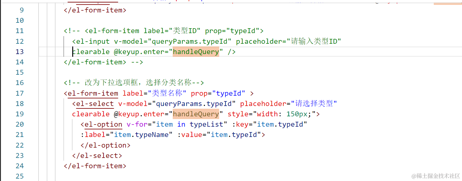 使用el-form-item定义表单元素,标签为"类型名称",绑定prop="typeId"用于表单验证。 使用el-select定义下拉选择框,绑定v-model="queryParams.typeId"实现选择值与数据对象的双向绑定,设置placeholder="请选择类型"作为占位符,clearable属性允许清空选项,@keyup.enter="handleQuery"监听回车键事件触发查询操作,style="width: 150px;"设置下拉框宽度为150像素。 使用el-option定义下拉选项,使用v-for="item in typeList"循环遍历typeList数组中的每个元素,将item.typeId作为选项的唯一标识符,item.typeName作为选项的显示文本,item.typeId作为选项的绑定值。 当用户选择一个类型或按下回车键时,会触发handleQuery方法进行查询操作。