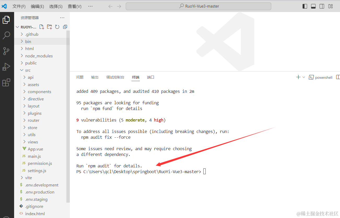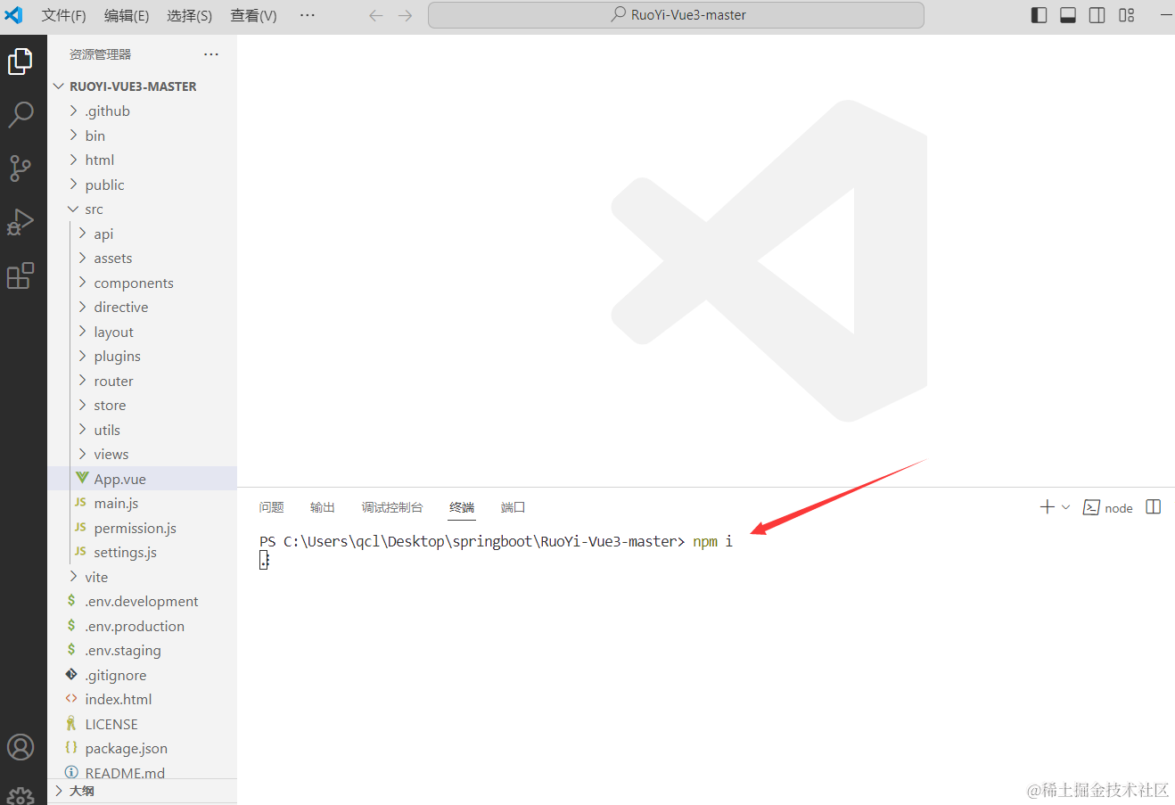 我们打开项目后要去安装依赖,安装依赖之前要记得安装node,我们这里使用npm i 来自动安装依赖。