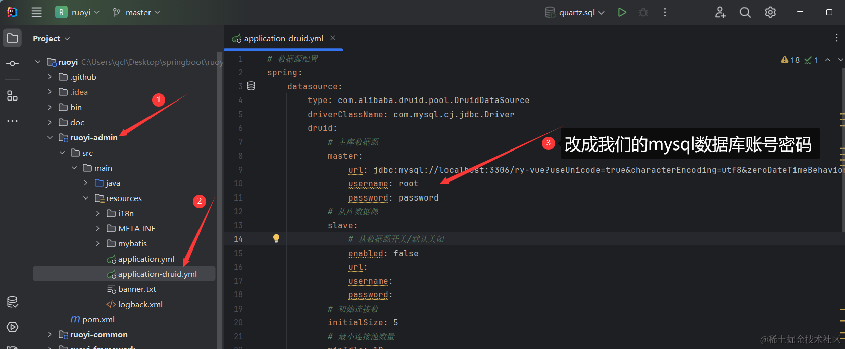 创建好数据库和数据表以后,我们需要在下图所示的地方修改myslq数据库的账号和密码,记得改成我们自己的。