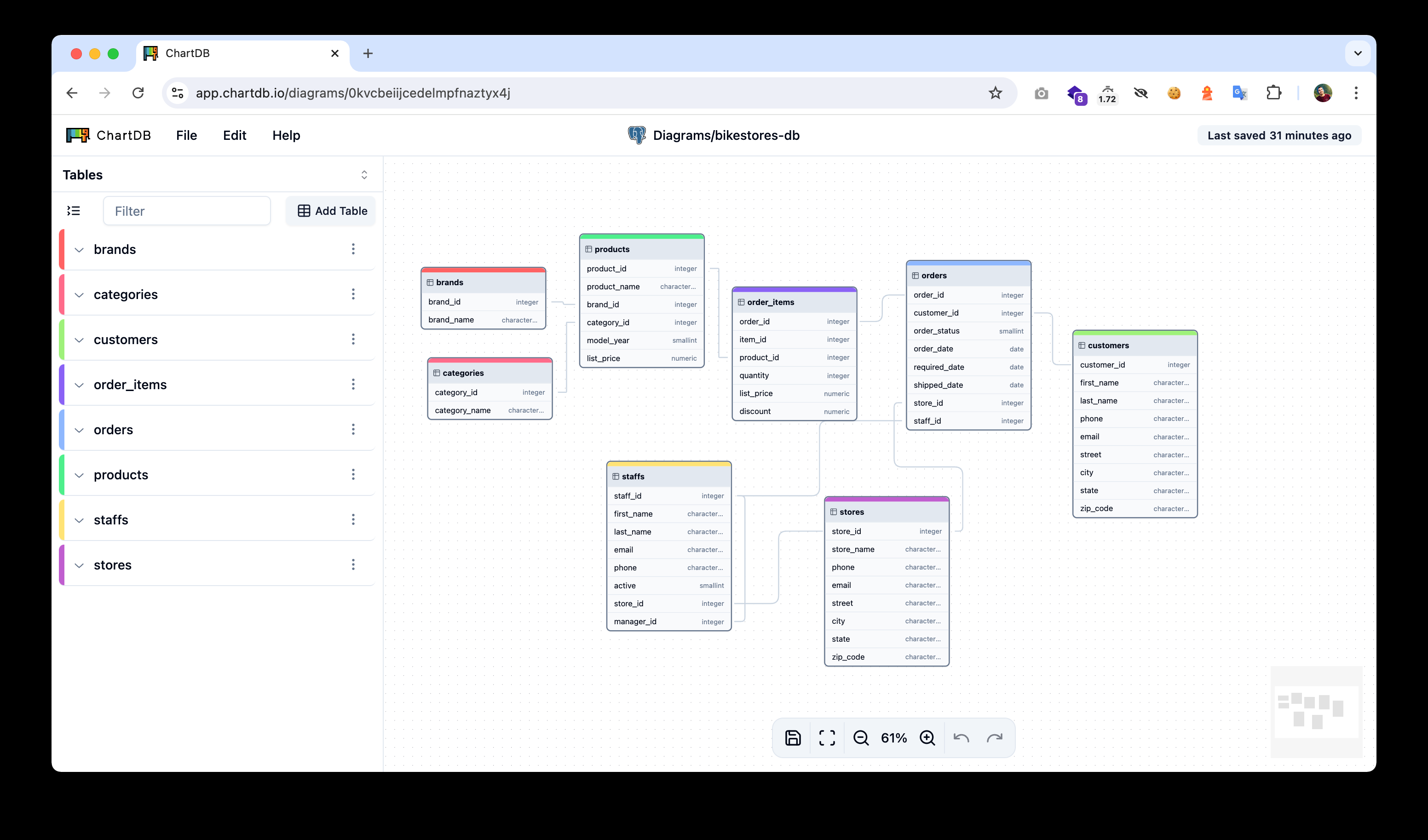 - 编辑和导出:使用 ChartDB 的交互式编辑器进行模式调整,然后导出 SQL 脚本进行迁移或文档化。