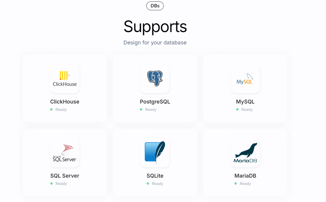 - 支持多种数据库:ChartDB 支持 PostgreSQL、MySQL、SQL Server、MariaDB、SQLite 和 ClickHouse 等多种数据库,提供了广泛的适用性。