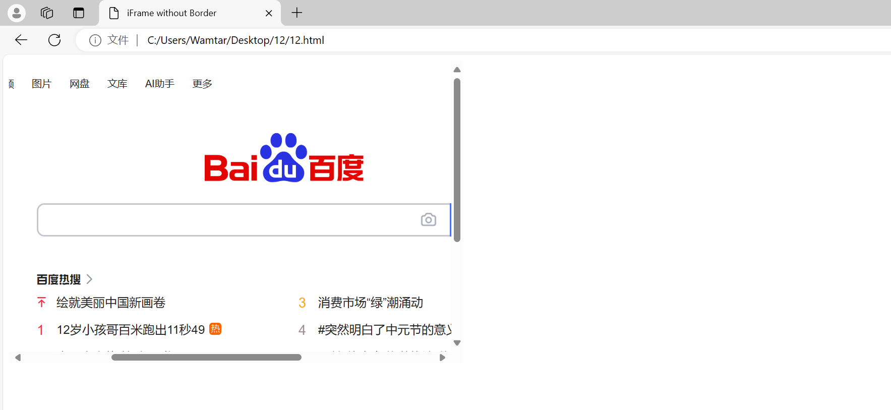 frameborder 属性<iframe src="https://www.baidu.com" width="600" height="400" frameborder="0"></iframe>