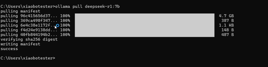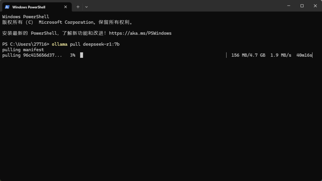在终端或命令提示符中,运行以下命令来下载 DeepSeek 模型:ollama pull deepseek-r1 ,默认情况下,这将下载 DeepSeek 的 7B 模型。如果需要其他大小的模型,可以指定版本。