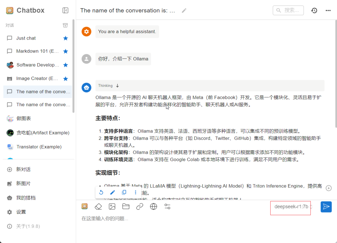 测试聊天:在 ChatBox 输入框内输入问题,例如“你好,介绍一下 Ollama”,确保 ChatBox 正确响应。