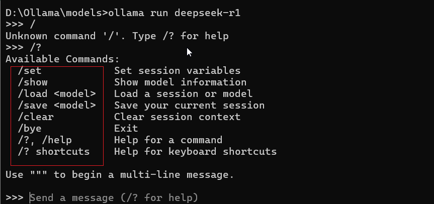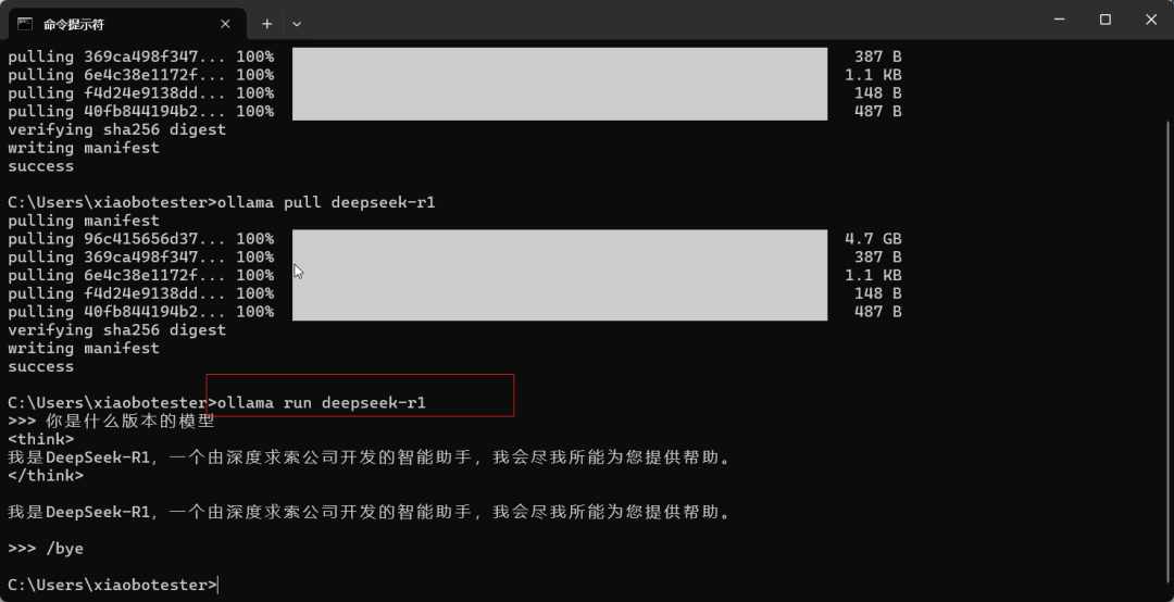 下载完成后,运行以下命令启动 DeepSeek 模型:ollama run deepseek-r1