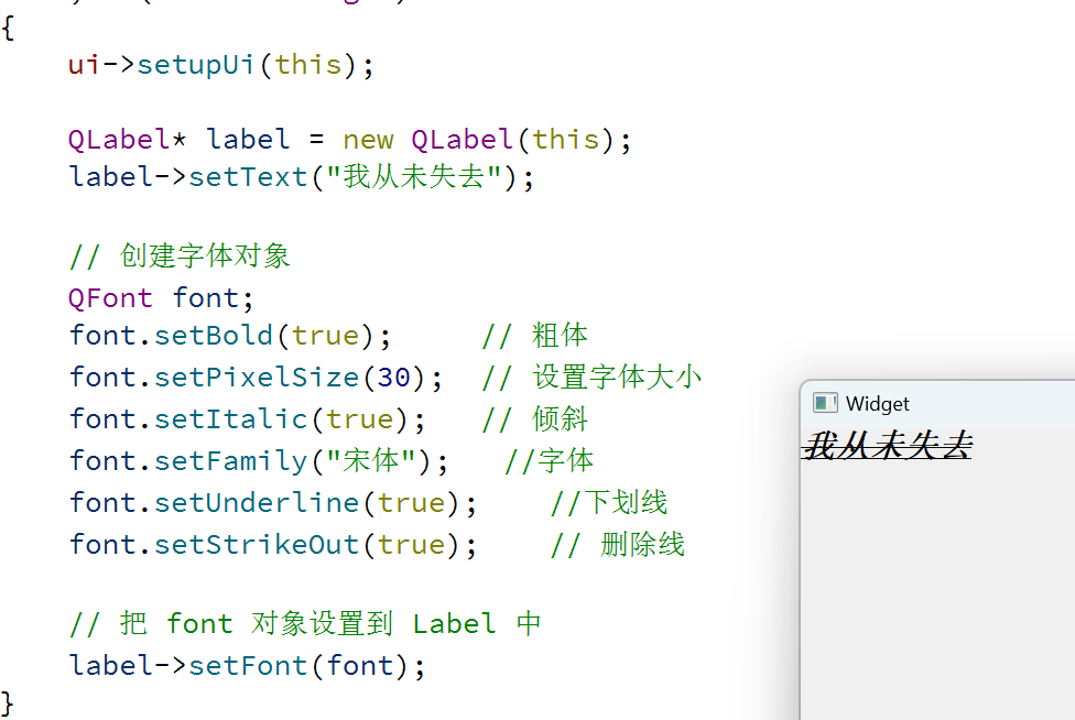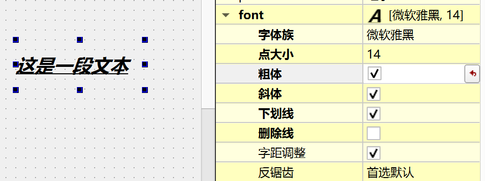 2)在右侧的属性编辑区,设置该 label 的 font 相关属性在这里调整上述属性,Qt Designer 能够对界面的属性设置支持 “实时预览”,因此我们可以实时的看到文字的变化。