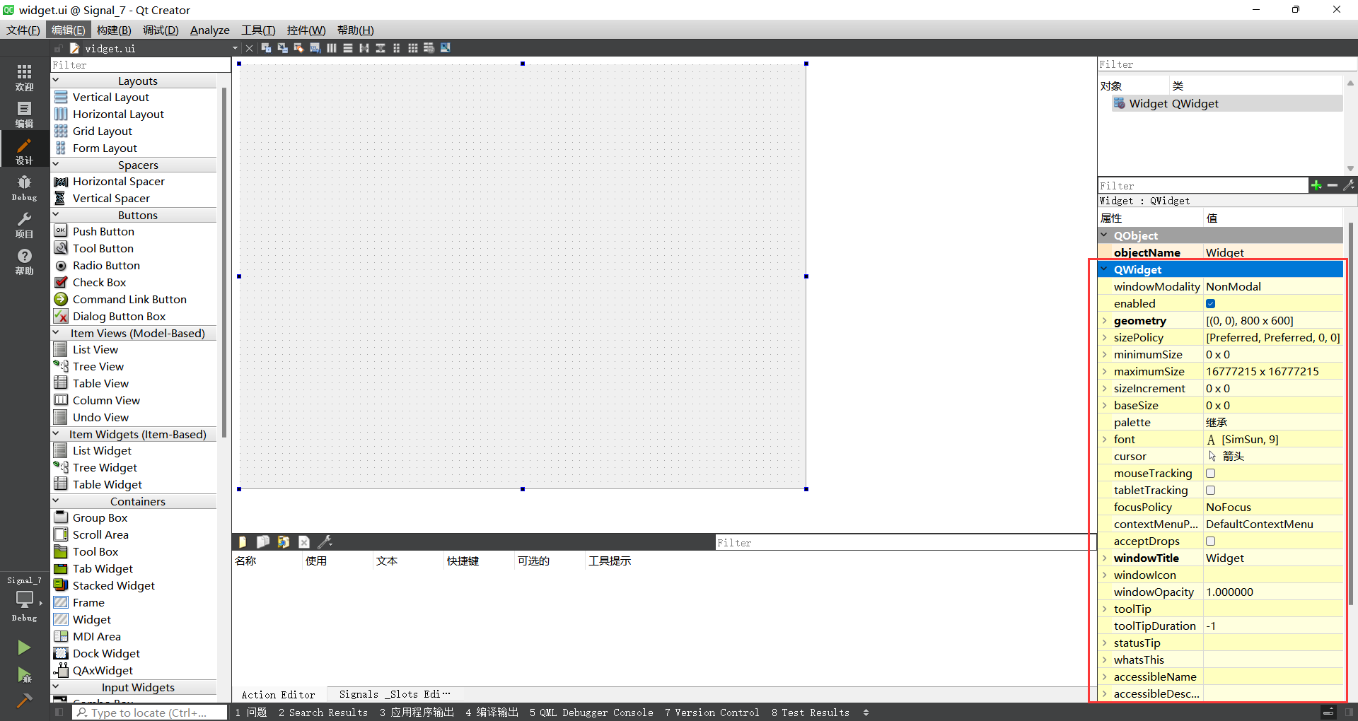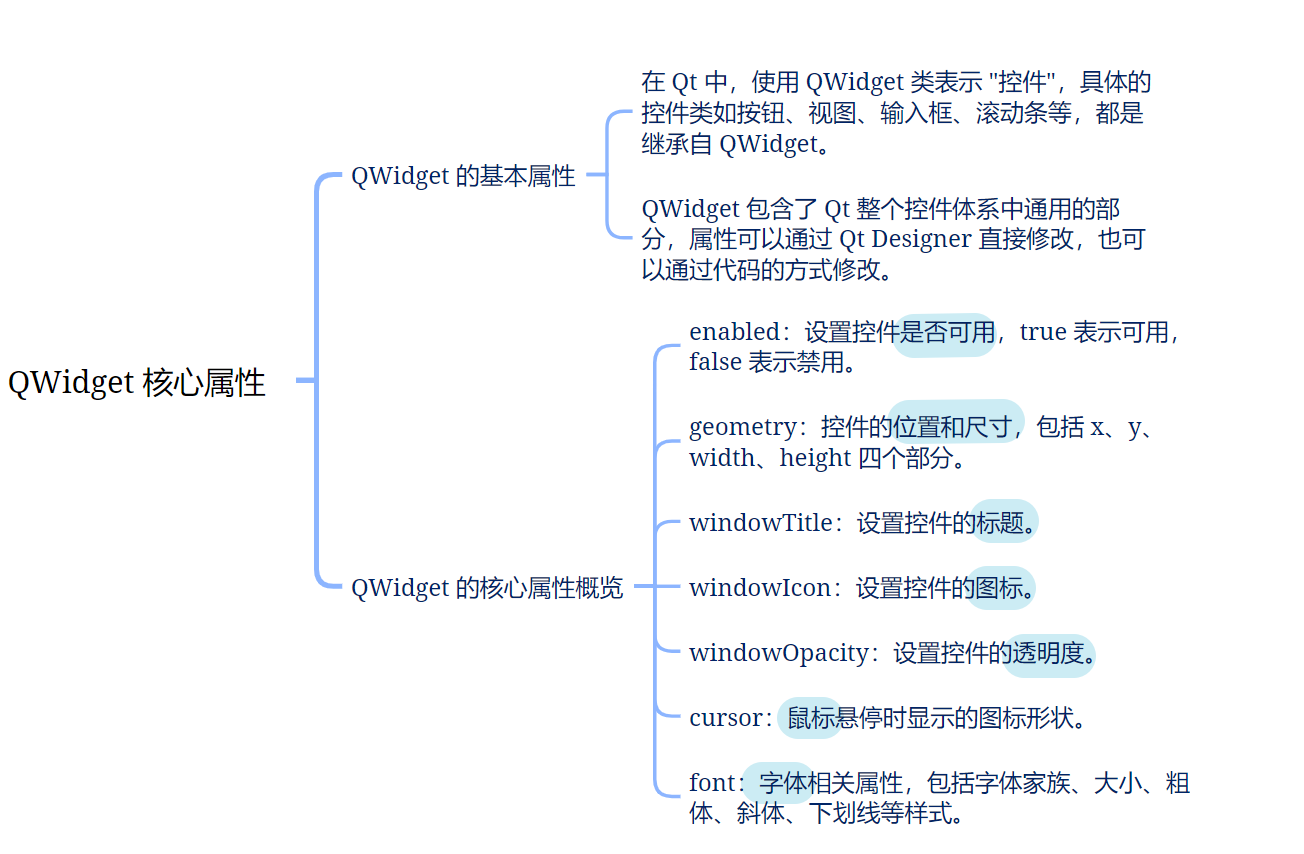 这些属性既可以通过 QtDesigner 直接修改,也可以通过代码的方式修改。这些属性的具体含义在 Qt Assistant 中均有详细介绍。