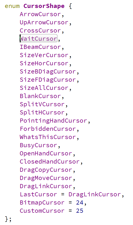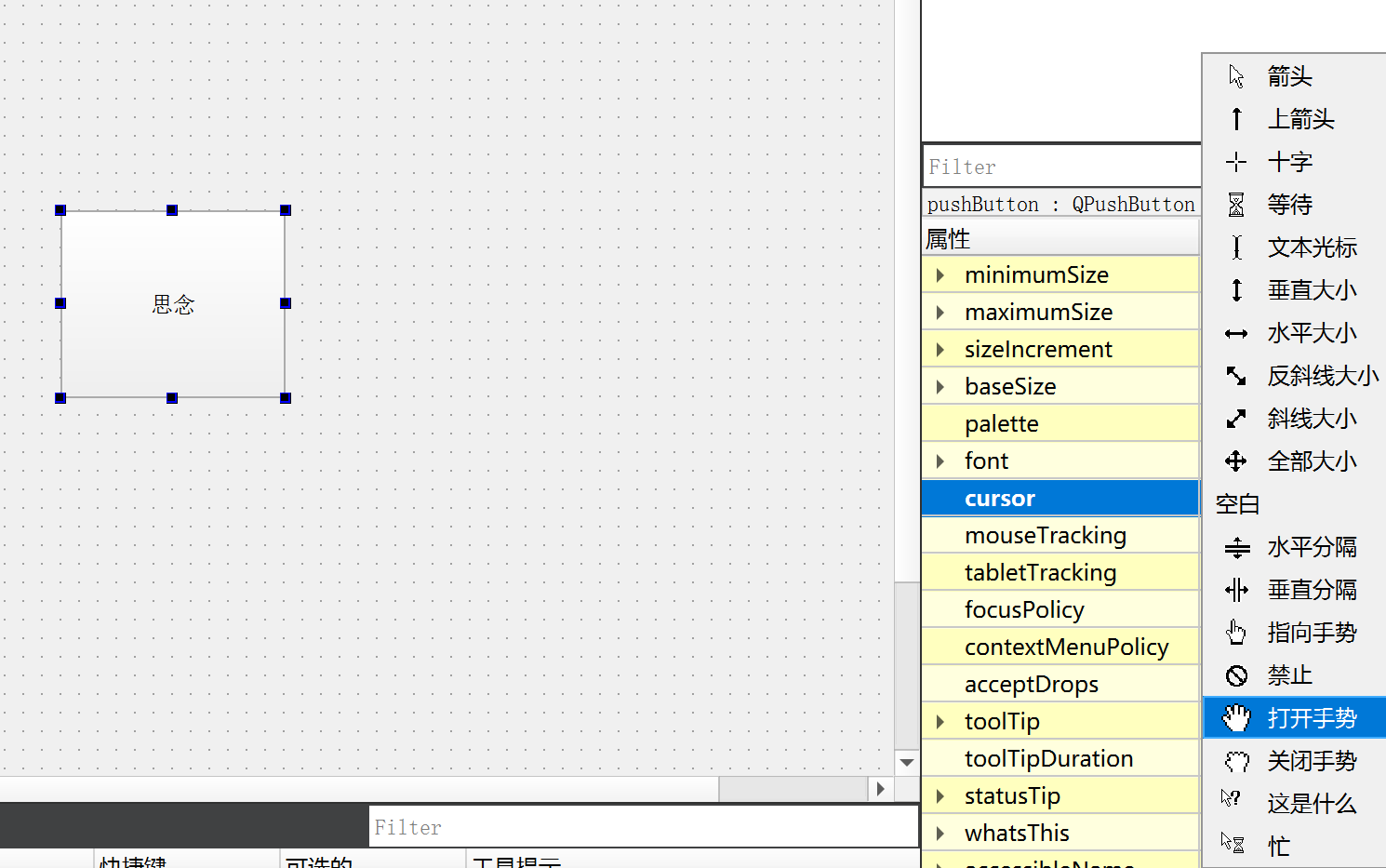 cursor | 设置鼠标悬停时显示的图标形状,如普通箭头、沙漏或十字等。可通过 Qt Designer 查看选项。 |