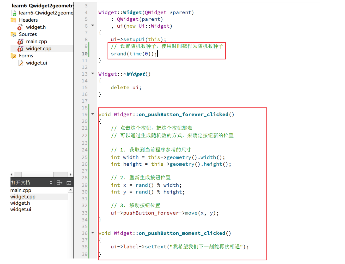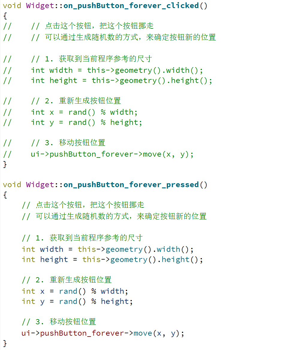 widget.cpp 中定义槽函数,使得当用户点击 “forever…” 拒绝按钮时,触发按钮逃跑的行为。clicked 事件(即鼠标点击后释放)实现。