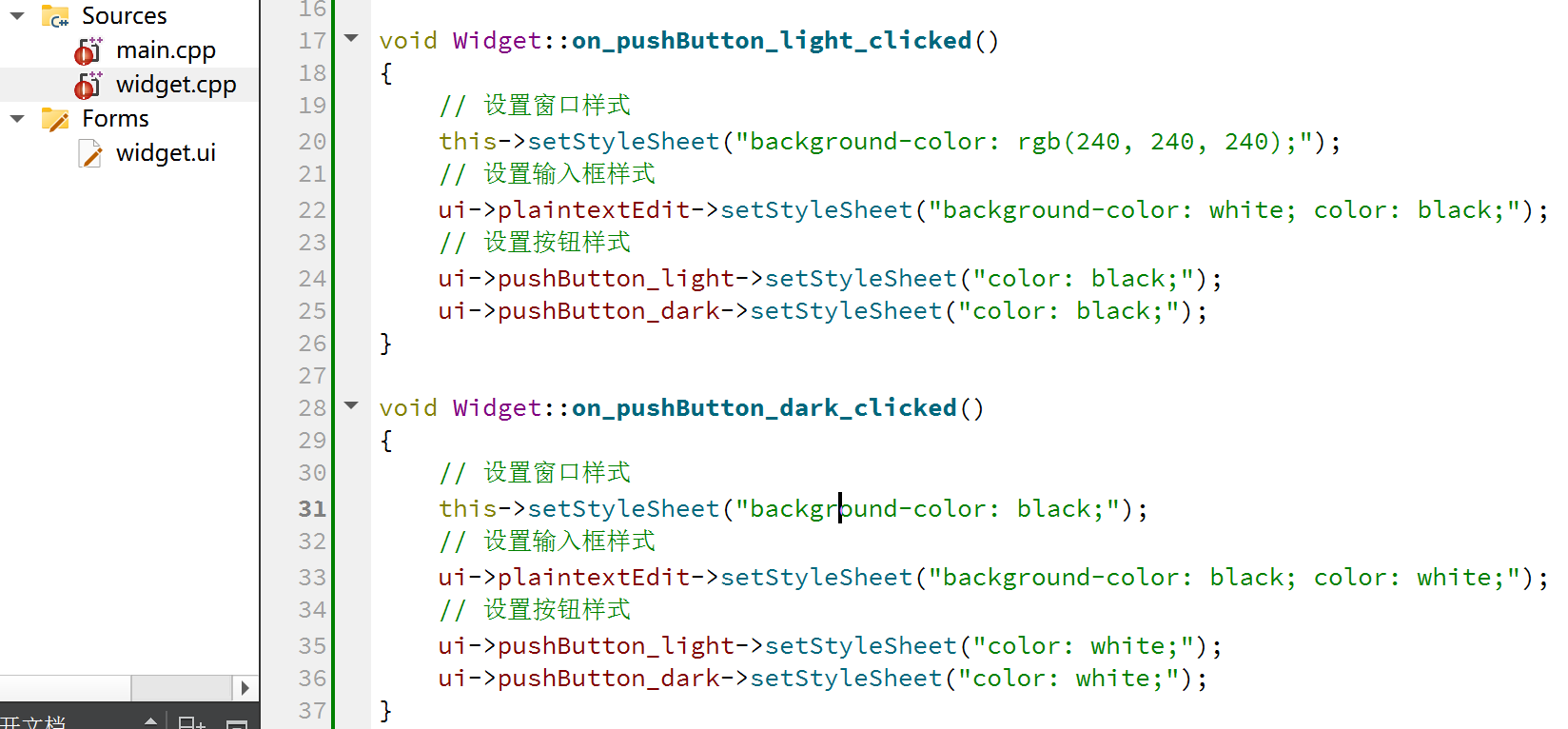 (1)在界面上创建一个多行输入框(Text Edit)和两个按钮objectName 分别为 pushButton_light 和 pushButton_dark