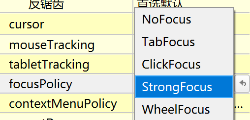 focusPolicy | 定义 widget 如何获取焦点:NoFocus, TabFocus, ClickFocus, StrongFocus, WheelFocus。 |