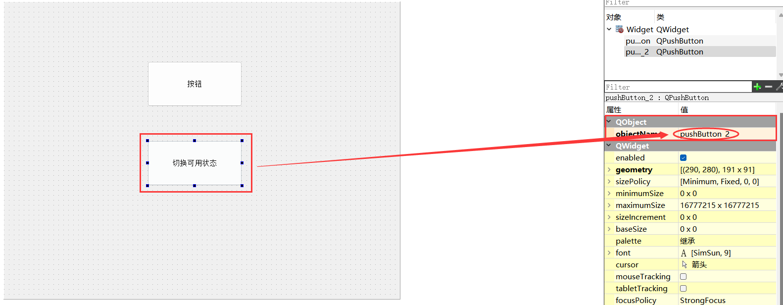 objectName 分别为 pushButton 和 pushButton_2QObject 的 objectName 属性介绍: