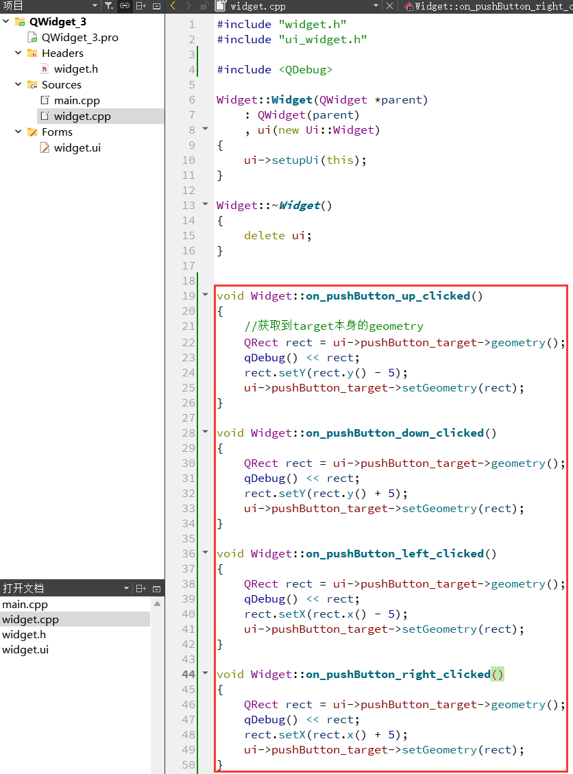 widget.cpp 文件中为每个方向的按钮添加槽函数,用于改变 pushButton_target 的位置。当点击相应的方向按钮时,会调整目标按钮的 x 和 y 坐标,从而实现位置变化
