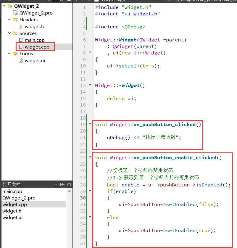 (2)编写 wdiget.cpp, 编写两个按钮的 slot 函数