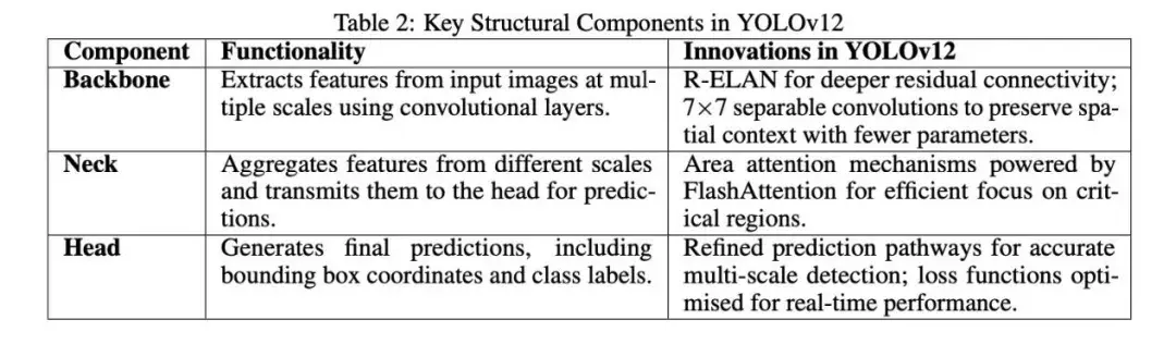 YOLO框架的成功历来依赖于一个统一的架构,该架构可执行边界框回归和对象分类,从而实现完全差异化的端到端训练。YOLOv12对这一核心原则进行了扩展,整合了新的架构创新,明确针对更高的精度、更低的延迟和更强的适应性而量身定制。如表 2 所示,YOLOv12的设计可分为三个主要部分:骨干(提取和处理多尺度特征)、颈部(聚合和完善这些特征)和头部(生成最终预测)。