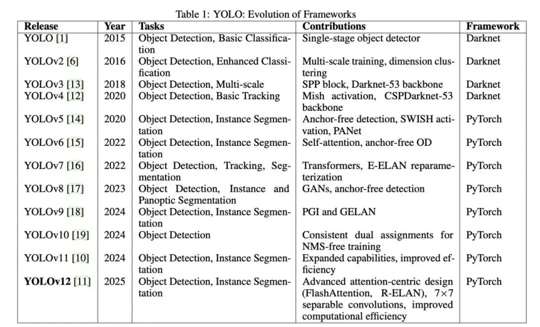 表 1 全面概述了YOLO模型的发展历程,重点介绍了每次迭代中引入的关键创新和改进。这些进步大大增强了物体检测能力,提高了计算效率,并扩展了模型的通用性,使其能够处理各种计算机视觉任务。