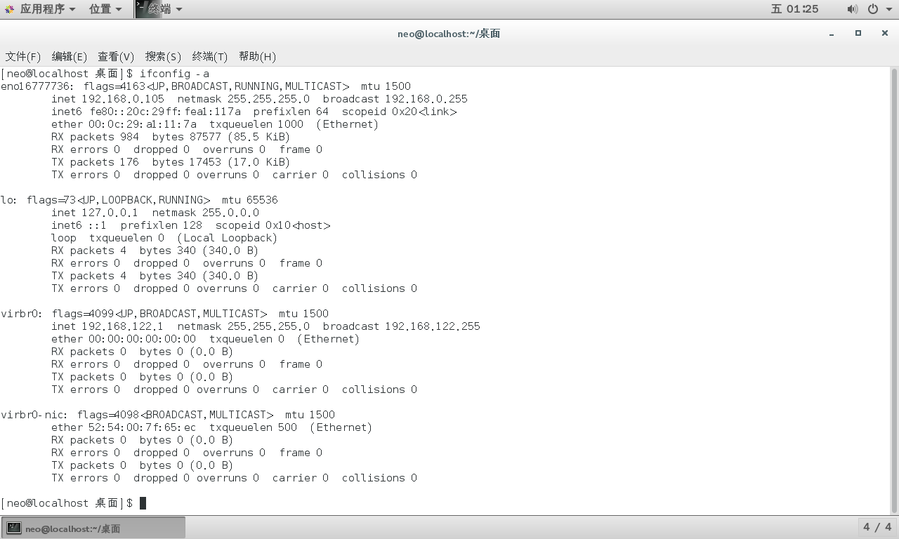 TX errors 0 dropped 0 overruns 0 carrier 0 collisions 0上面的输出中,eno16777736 是一个以太网接口,lo 是一个本地回环接口,virbr0 是一个虚拟网桥接口,virbr0-nic 是一个虚拟网桥接口的物理网卡。其中,inet 行显示了每个接口的 IP 地址,netmask 行显示了子网掩码,broadcast 行显示了广播地址,ether 行显示了 MAC 地址。