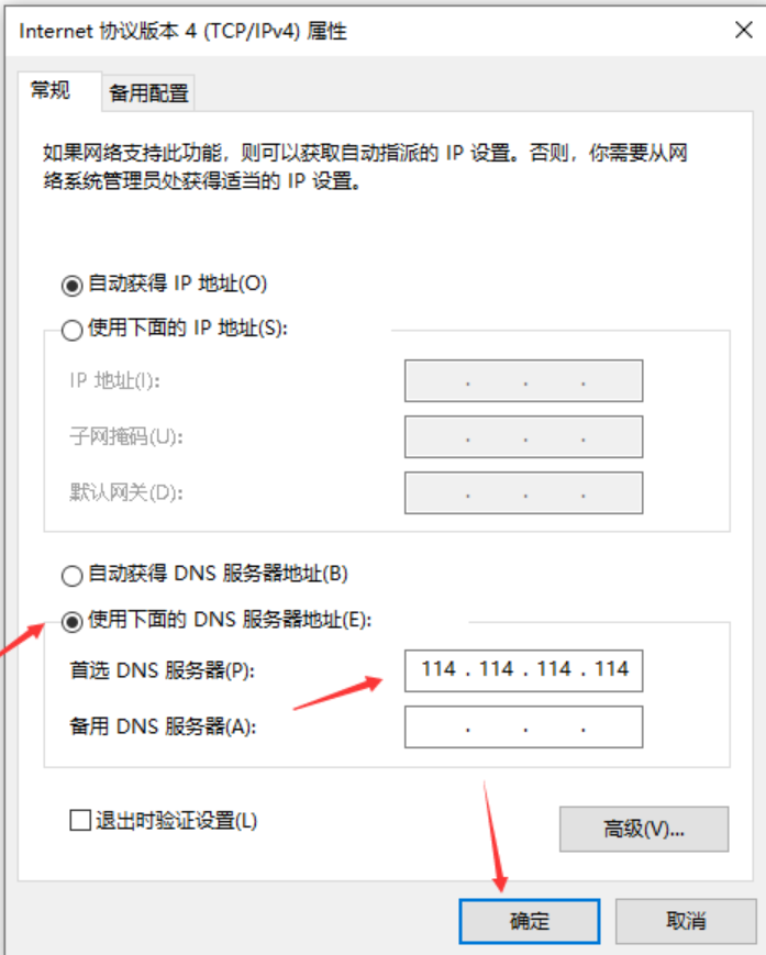 将自动获取 DNS 服务器地址更改为 使用下面的 DNS 服务器地址,然后填写 DNS 服务器地址,然后点击 确定: