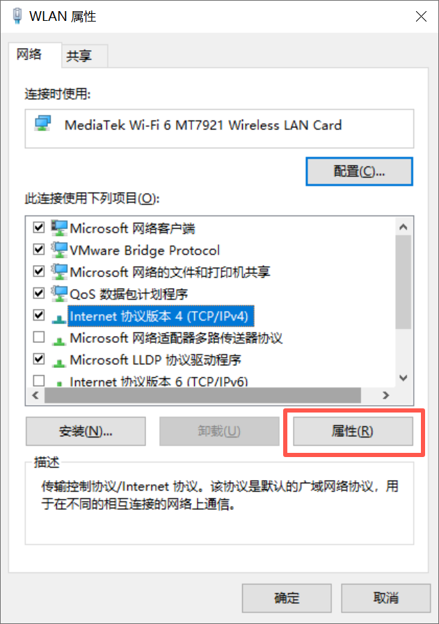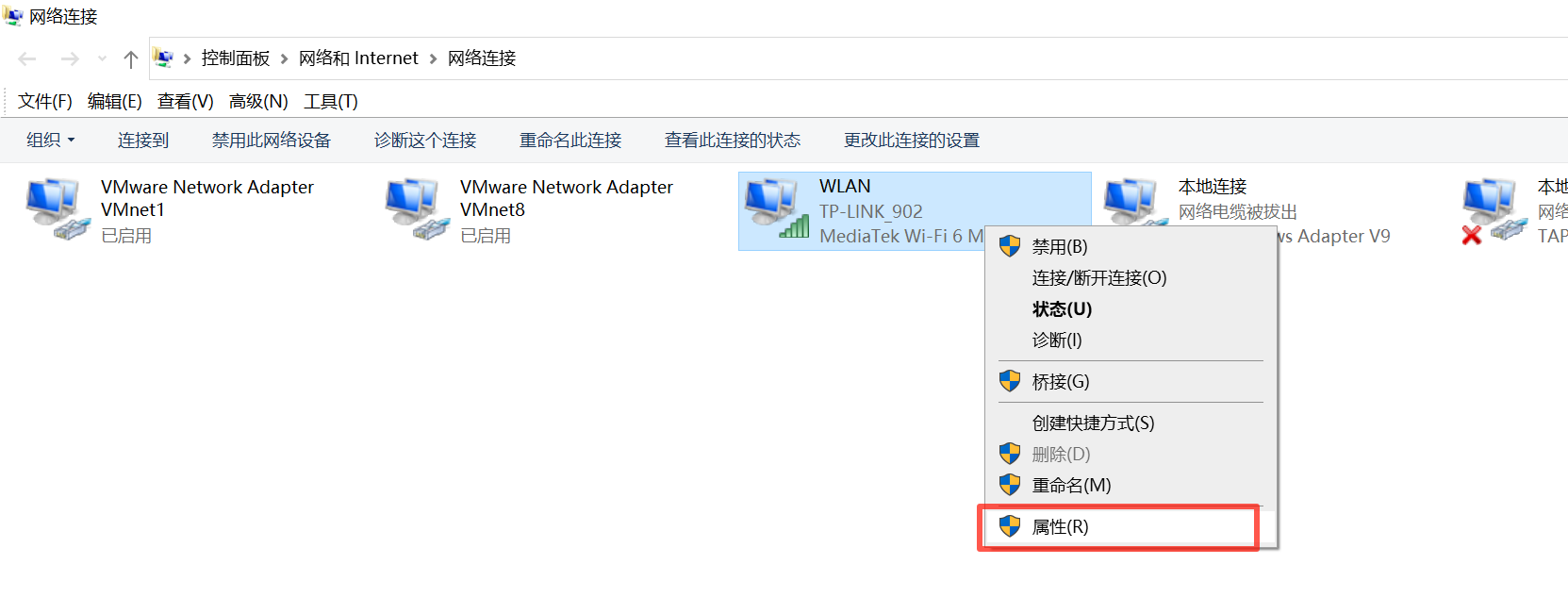 VMware 开头的是虚拟机的网卡,这里找到我们自己实际使用的网络然后鼠标右键属性: