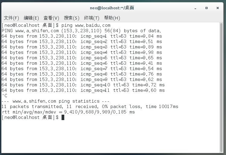 测试一下,打开 终端,然后输入 ping www.baidu.com,打开终端可以直接在桌面鼠标右键: