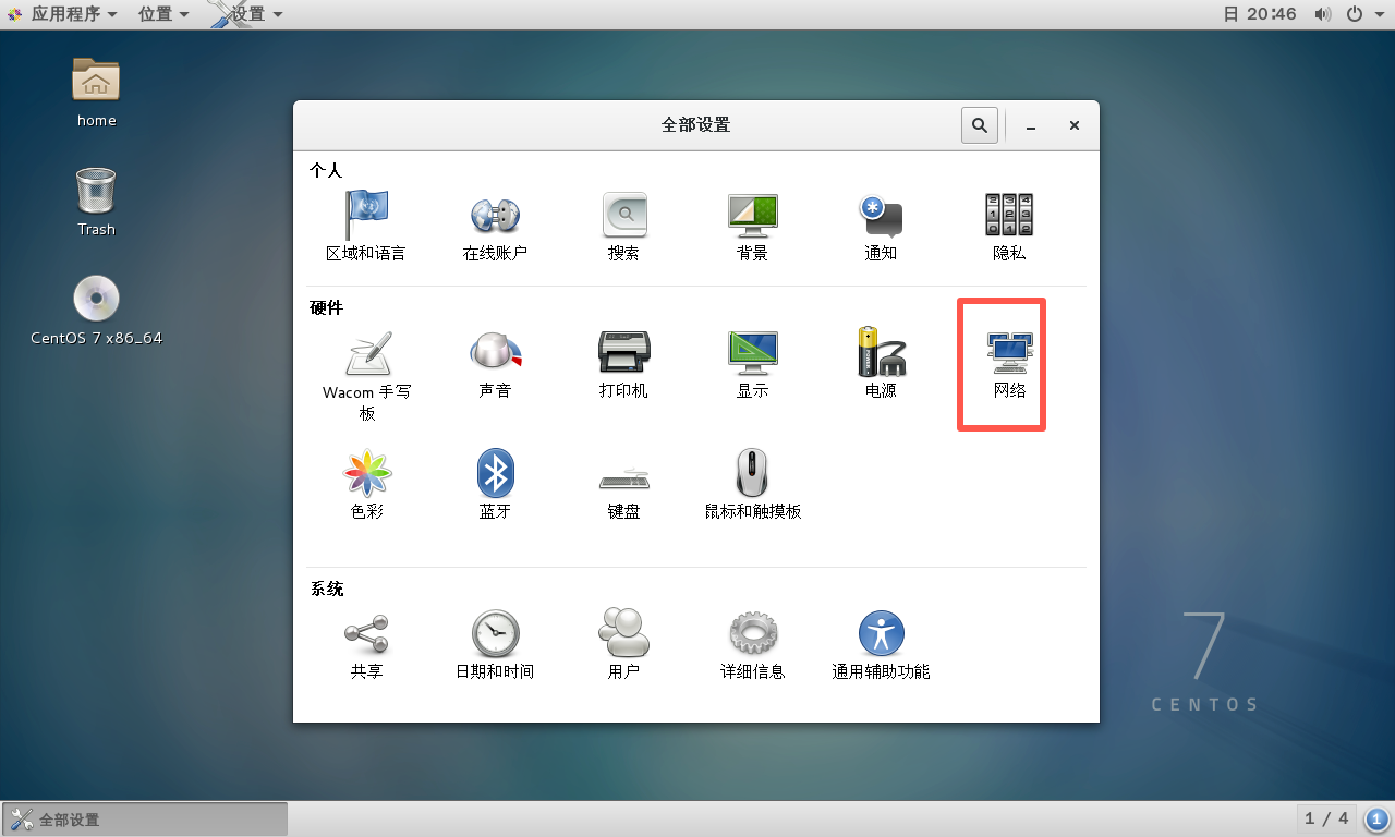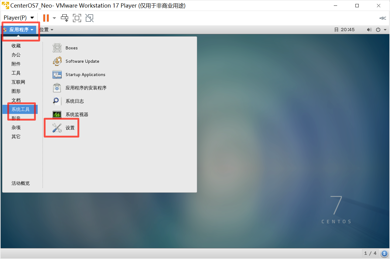 首先进入到 Linux 系统中,然后找到:系统工具,然后选择 设置: