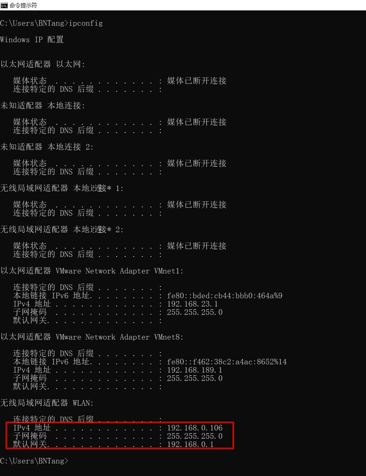 然后输入 ipconfig,然后我们想要的信息就会出现,我电脑连接着 WIFI,所以我们这里找到 无线局域网适配器 WLAN,查看 IPv4 地址、子网掩码、默认网关: