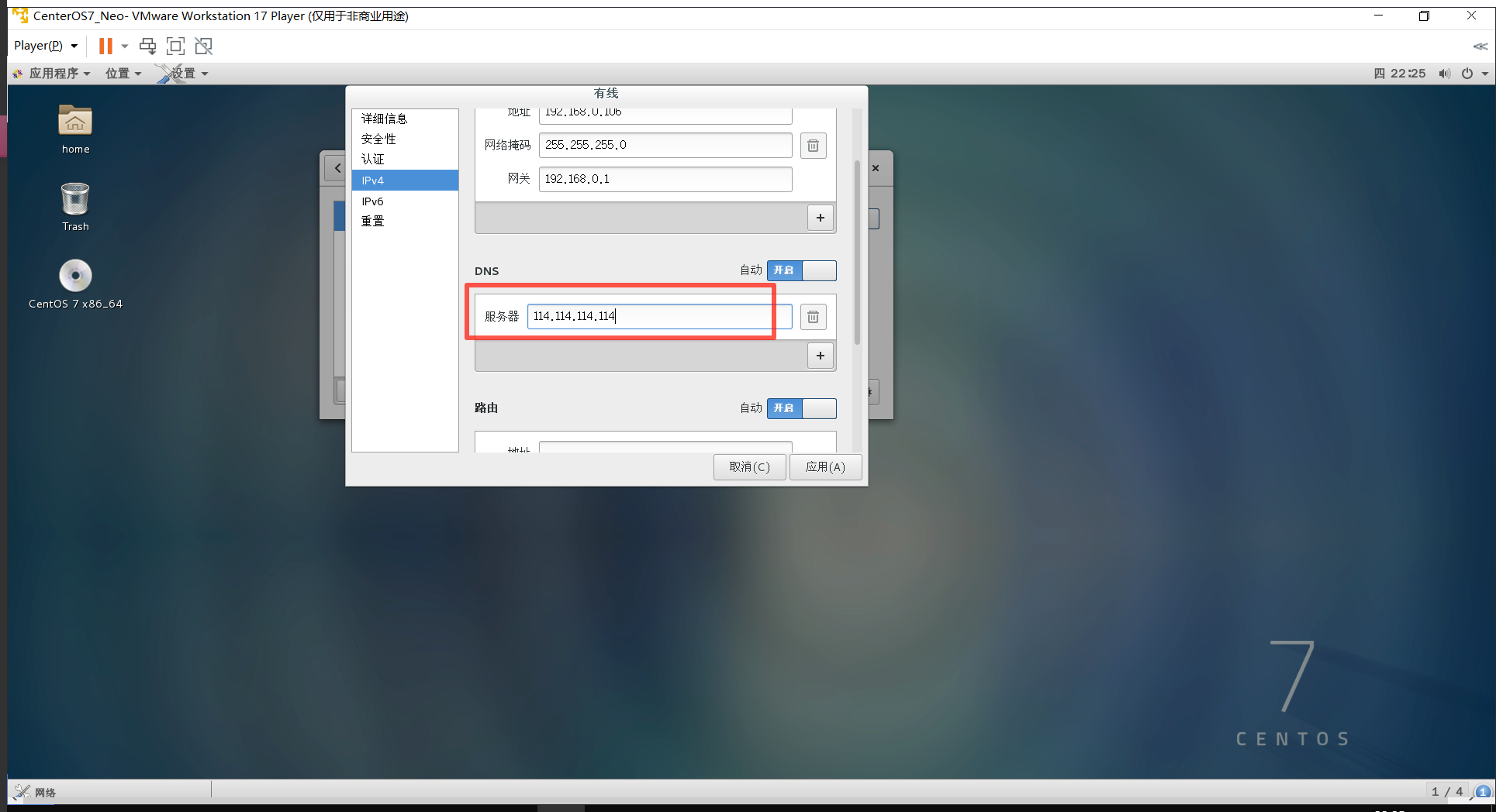 我这里填写的是 114.114.114.114,然后点击 确定,然后再回到 Linux 系统中,DNS 也填写 114.114.114.114。