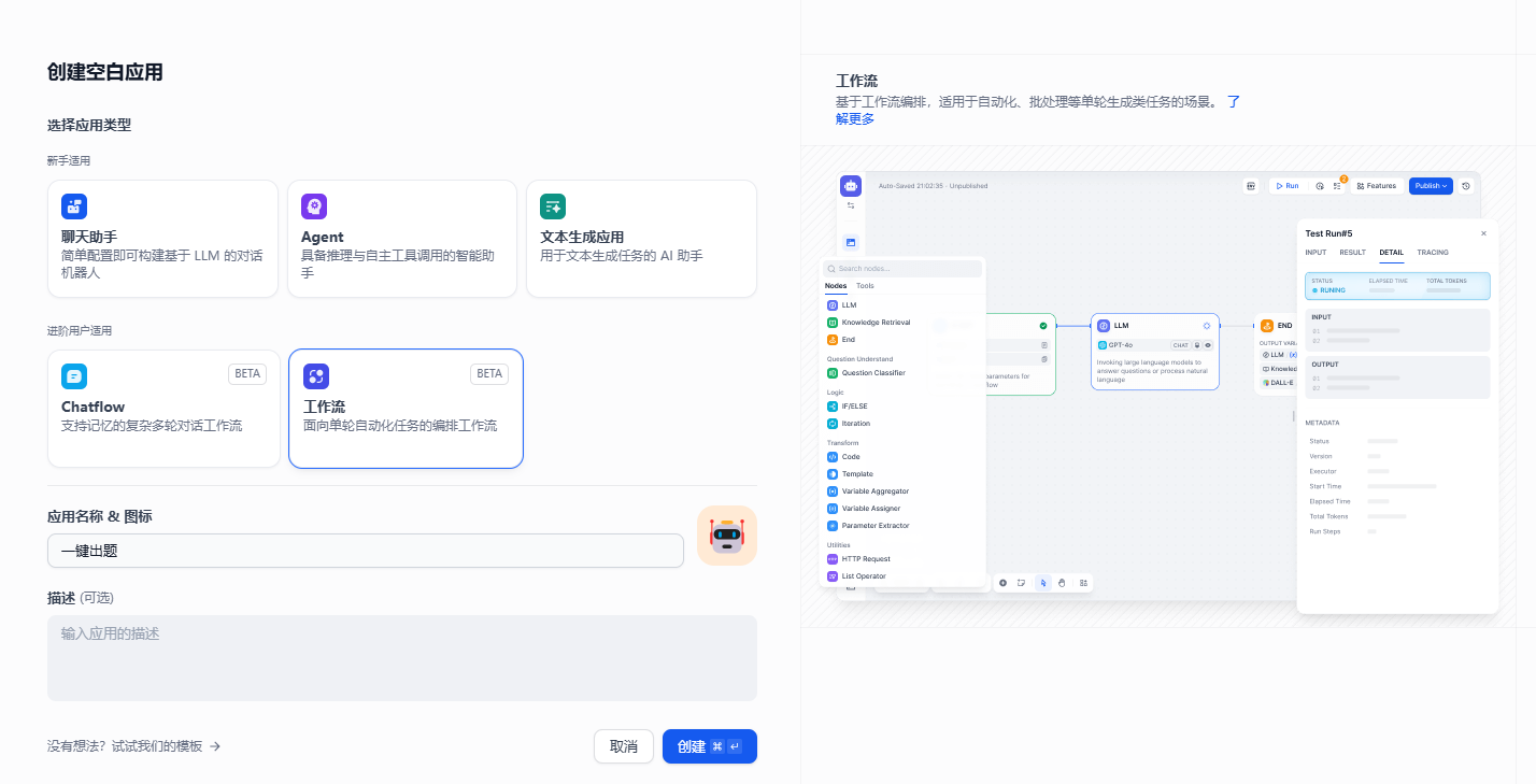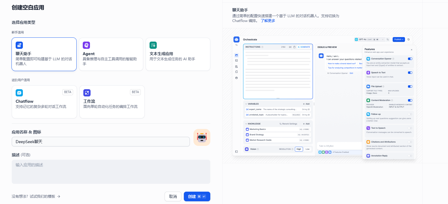 - 在Dify中点击创建空白应用,选择聊天助手,点击创建