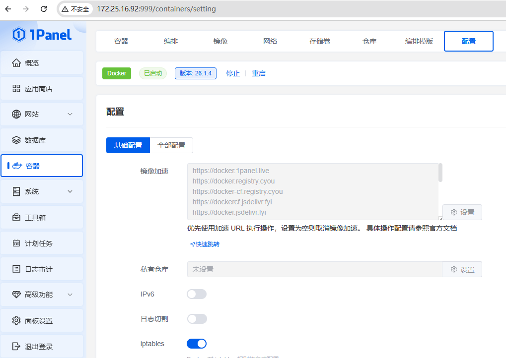 - 在1Panel面板后台完成Docker镜像加速配置