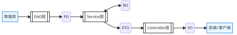 BO | Service层内部业务逻辑 | 封装复杂业务逻辑,可包含多个PO的组合 |
