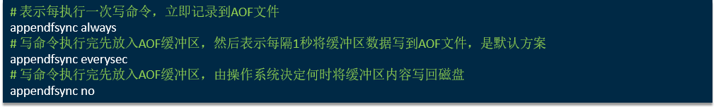 everysec | 每秒刷盘 | 性能适中 | 最多丢失1秒数据 |