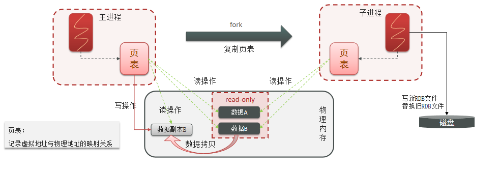 bgsave开始时会fork主进程得到子进程,子进程共享主进程的内存数据。完成fork后读取内存数据并写入 RDB 文件。fork采用的是copy-on-write技术: