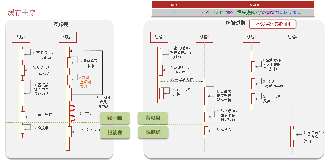 当然两种方案各有利弊:如果选择数据的强一致性,建议使用分布式锁的方案,性能上可能没那么高,锁需要等,也有可能产生死锁的问题;如果选择key的逻辑别除,则优先考虑高可用性,性能比较高,但是数据同步这块做不到强一致。