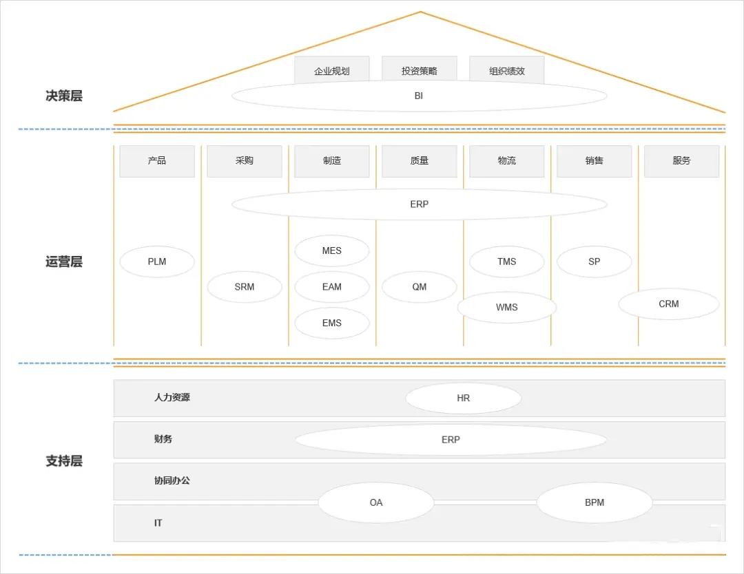 在企业信息化数字化过程中,我们常会遇到诸多系统,如 ERP、MES、SCM、SRM、PLM、CRM、QMS、WMS、BI、APS、SCADA、HR、BPM、TMS、EAM、EMS。这些系统究竟是什么?具备哪些功能和作用?它们之间又存在怎样的关系?